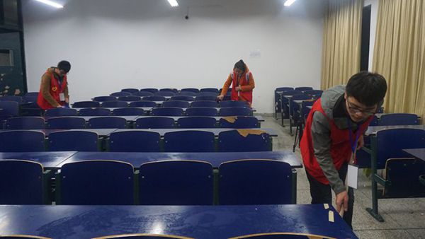 志愿者们自发的带上清洁工具在五教大门前集合。活动开始前,志愿者队长吴明进行了工作区域的划分,同时向大家具体介绍了一些如何除去桌面上的污渍和如何对教室环境卫生进行清扫等技巧。为了更高效率地完成任务,他还将志愿者们分成三个小组,以小组为单位分别对不同的考场教室进行清扫。看到一片狼藉的教室并没有消减志愿者们的热情,反而让他们对工作更加用心,在各个成员的相互配合努力下,教室变得焕然一新。志愿者们一丝不苟的工作态度、高效的工作效率以及高度的个人素质获得了保洁阿姨们的一致好评,也带动和影响着其他同学维护教室卫生的自觉性。