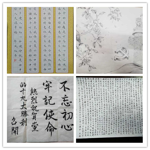 在中华古典乐器二胡和笛子合奏的《赛马》中书画大赛缓缓拉开序幕。本次书画大赛有软笔、硬笔和画作三个部分,选手紧紧围绕“岁月鎏金,勿忘初心”的主题,结合党的十九大精神,发挥自己的想象力和创造力,创作作品。从选手专注的表情中可以看出他们对自己作品的高标准,严要求,还有争当优秀的希冀。作品创作完成后,选手们对自己的作品进行了展示和进一步的解读。本次比赛的作品花样繁多,字体方面有楷书、行书,画作也涉及油画、水彩画和素描等多个方面,给人丰富的视觉体验。而选手们在解读自己的作品时,声情并茂、立意高远,以情动人、以才服人。