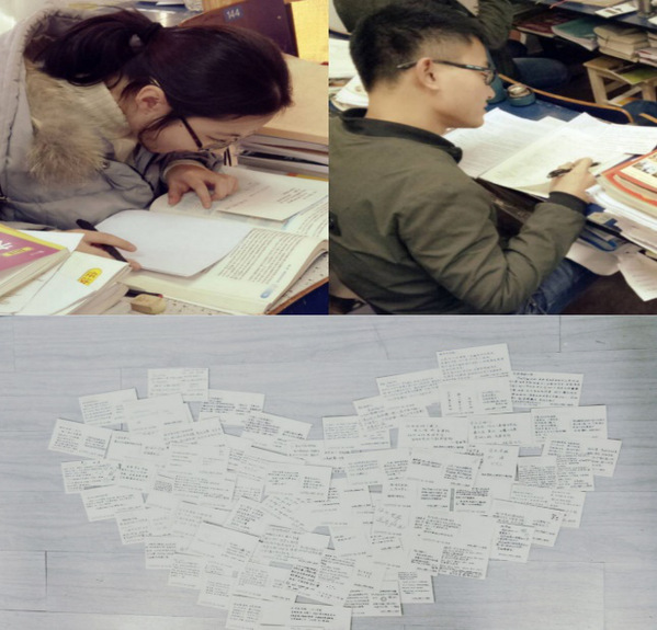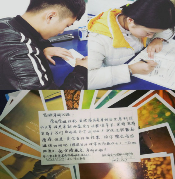 12月8日中午,利用考研同学休息的间隙,工作人员将这些爱的礼物送到了考研学子的身边。临近午饭时间,仍有很多同学在紧张的复习,为了不打扰大家的学习,工作人员小心的将每一份明信片放在大家桌上。收到这样一个小小的礼物,很多同学先是惊喜,进而感动。大家都觉得在考研冲刺阶段,这样的祝福,给了他们莫大的鼓励和信心,十分感谢这次活动让他们感受到来自身边的温暖。