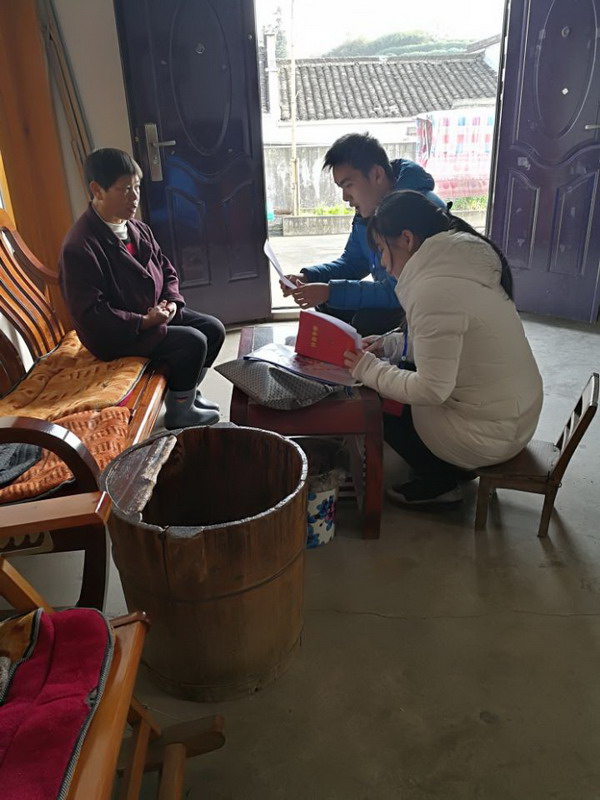 在当地扶贫办的带领下,小组成员立足村情实际,入户访谈。通过实地走访,拍录贫困村的村容村貌、田地、村民的生活状况等,为以后全面脱贫收集详实可靠的第一手资料。成员们深入到贫困户家庭,指导村民填写调查问卷,看到了政府为他们所做的实事,以及生活水平不断提高所流露出的真挚喜悦。在走访调研过程中,小组成员们发现除了国家颁布的扶贫“十大工程”,许多地区还根据当地特点实施了具有地方特色的政策:如身处大山沟的龙源村根据自身特点实行特色泉水鱼养殖产业扶贫,通过建立泉水鱼养殖基地,扶持贫困户特色养殖产业发展。樵山村则始终把发展特色种植扶贫作为工作重心之一,突出发展油茶、香榧等特色种植业,让农民们从根本上解决贫困问题。“党恩播福泽异地搬迁农家乐,国策赐祯祥进住高楼万户欢”,大红的对联更是表达了危房改造和异地搬迁户的集体心声。
