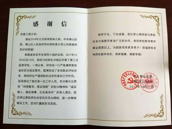 桃李不言,下自成蹊。活动结束后,中共黄山区委、黄山区人民政府特意发来感谢信。诚挚感谢78名小组成员严谨细致的工作作风,高度赞扬了学校“尚德敏学、唯实惟新”的校训精神和“诚实做人、踏实做事、扎实做学问”的育人理念,并表示将以学校师生的学风作风为榜样,进一步做细做实工作,坚决打赢脱贫攻坚战。