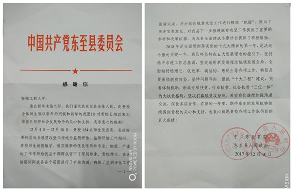 在5天的监测评估期间,汪张林、孙宏义两位带队领导走遍15个乡镇,慰问看望了全体师生,我校师生时刻谨记“尚德敏学,惟实唯新”的校训精神,不但圆满完成监测评估任务,也彰显了我校优良的校风学风。我校师生专业、细致、严谨的工作作风得到了东至县以及各乡镇干部的肯定,他们对RayBetApp官网下载 高度评价,东至县委县政府发来感谢信,对全体师生的工作给予了充分肯定和赞扬。
