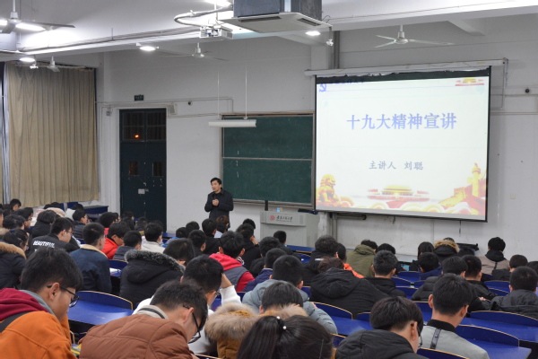 根据校团委要求和部署,为了认真落实学习宣传贯彻党的十九大精神专题培训任务,机械与汽车工程学院于12月8日晚19:00在6教215教室进行了十九大精神宣讲会。主讲人由马克思主义学院教授刘聪担任,青马班和团支书班长近三百人参加本次培训。