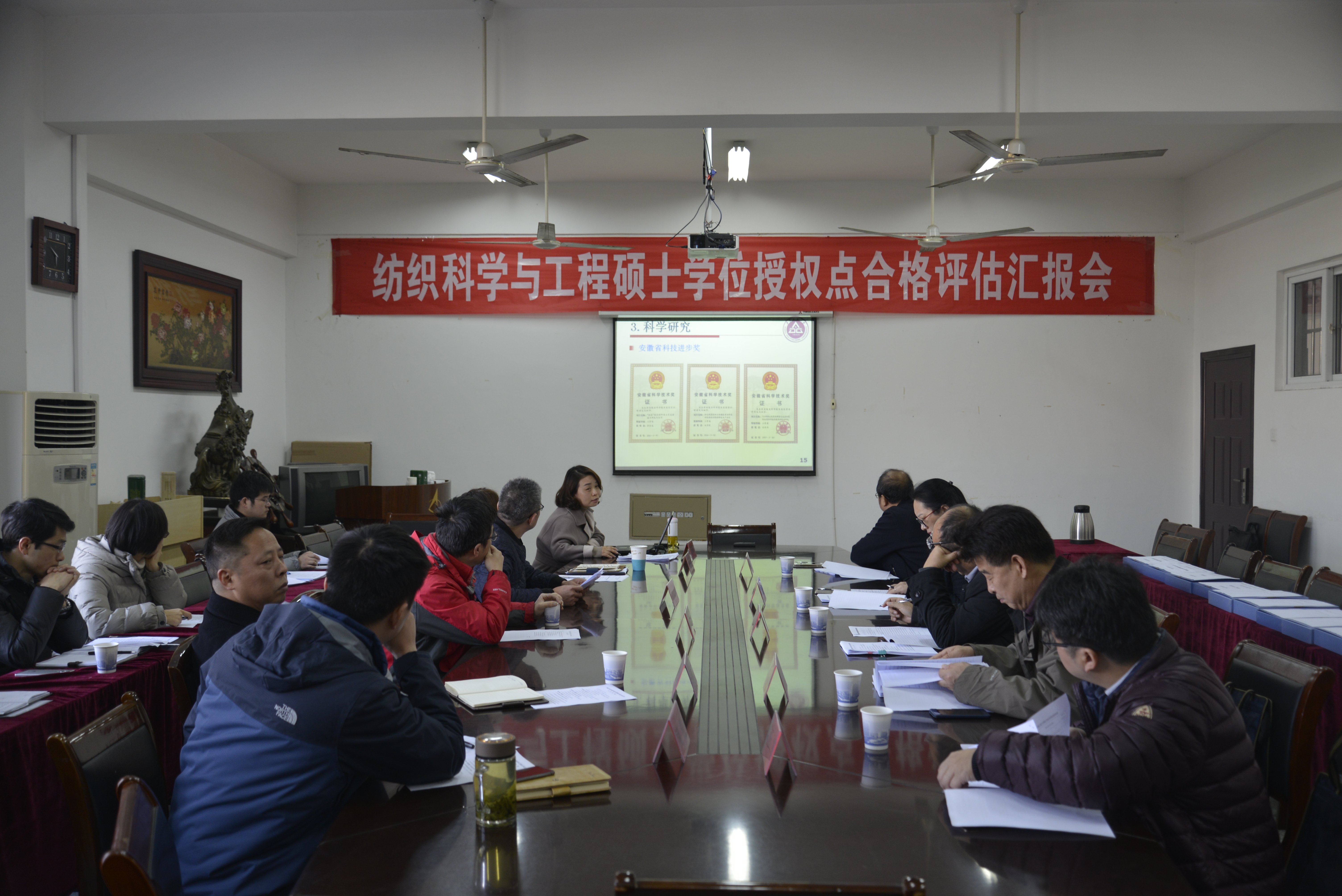 评议会的第一阶段由纺织服装学院党委书记纪天新主持,在介绍了专家组组成后,刘一致欢迎辞。刘一代表学校对评估专家组的到来表示感谢和欢迎,希望各位专家为我校纺织科学与工程硕士学位授权点自我评估材料认真把关,多提意见和建议,也恳请各位专家对学位点的长远发展提出宝贵的建议。