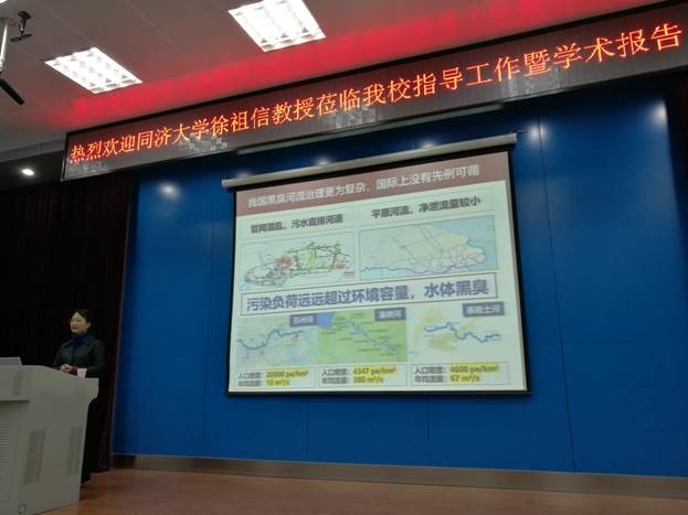 近日,应生化学院的邀请,上海市人民政府参事、同济大学环境学院博士生导师徐祖信来我校做了一场题为《城市黑臭河流治理主要问题与关键技术》的学术报告。生化学院院长薛正莲、副院长杨仁春、环境工程专业和给排水专业部分教师、生化学院研究生和环境工程专业本科生等300余人参加了此次报告会。报告会由薛正莲主持。