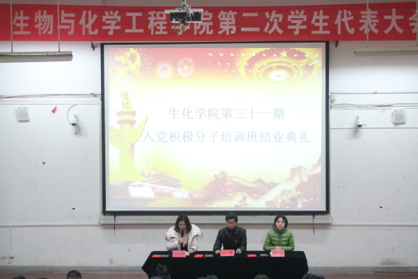 12月26日下午,生化学院于2教报告厅隆重举行第三十一期入党积极分子培训班结业典礼。生化学院党委副书记王辉、团委书记胡云老师出席了此次典礼。典礼由本期党校班主任章文宜老师主持,113名入党积极分子到场参加。