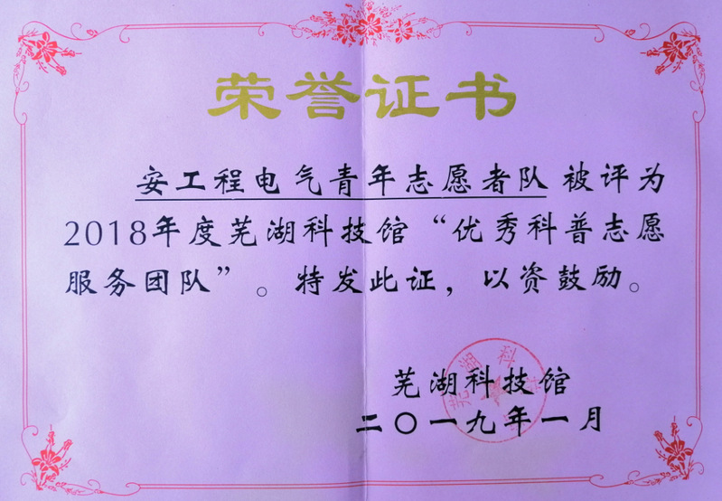 近日,在芜湖科技馆2018年“优秀科普志愿者”和“优秀科普志愿服务团队”评选中,电气工程学院团委学生会青年志愿者队获得“优秀科普志愿服务团队”称号,其中8名志愿者者获得“优秀科普志愿者”称号。1月13日,部分志愿者代表参加了芜湖科技馆的青年志愿服务表彰大会。志愿者们表示,今后将会继续努力,让持续了六年的科技馆科普志愿活动传承下去,带动电气学子积极投身其中,感受志愿服务的温暖和乐趣,让志愿服务的奉献精神薪火相传。