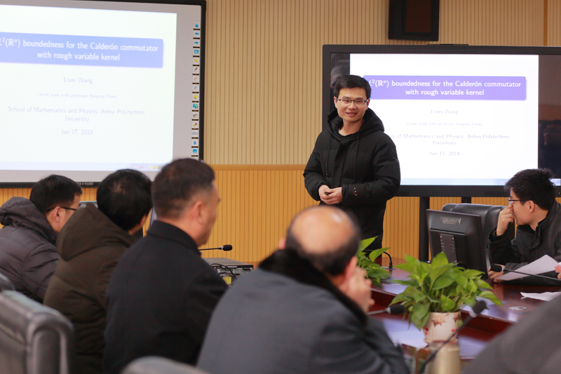 会上,五位在外攻读博士学位的青年教师代表对自己近期的研究成果进行了汇报和展示。北京科技大学数学专业博士生王立伟做了题为《L2 boundedness for Calderon commutator with rough variable kernel》的学术报告,南京理工大学数学专业博士生邓寿年做了题为《Convergence of the split-step theta-method for stochastic age-dependent population equations with Markovian switching and variable delay》的学术报告,浙江工商大学统计学专业博士生姜培华做了题为《基于小样本退化数据的可靠性建模与统计推断》的学术报告,南京理工大学数学专业博士生沈明轩做了题为《Stability of highly nonlinear neutral hybrid stochastic differential delay equations》的学术报告,中央财经大学金融学专业博士生潘海峰做了题为《银行、房地产市场与中国宏观经济波动》的学术报告。五位汇报人围绕报告主题就本领域的研究现状、研究方法、发展趋势等进行汇报,并与在场师生展开了积极而有深度的探讨和交流,报告会现场气氛热烈,学术氛围浓郁。