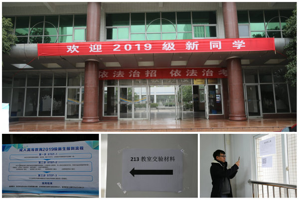 2月23日,新生报到工作在四号教学楼213教室进行。为方便同学报到,学院在教学楼前悬挂迎新条幅,张贴报到流程图。