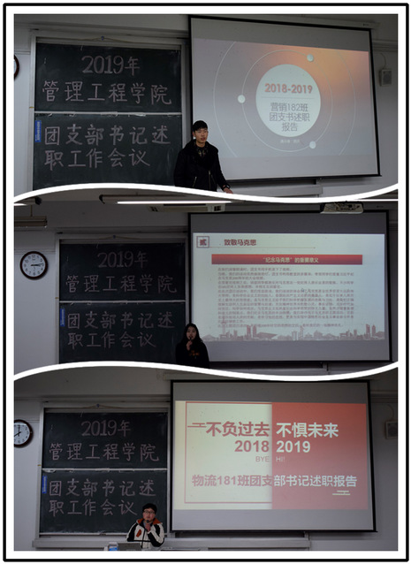 会上,各班级团支书用精心准备的PPT,从思想引领、青年发展、从严治团、共青团改革四个方面部分进行述职,围绕团支部特色活动及成果进行了汇报,充分展示各团支部积极向上的精神面貌和丰富多彩学习生活,同时分享了在具体工作中遇到的困难,总结经验,并对2019年的工作进行了规划和展望。