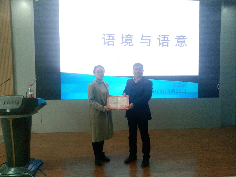 3月29日下午,芜湖宸宇锅炉工程技术有限公司国际部经理牟立群女士应邀来我校参加MTI校外导师聘任仪式,并为我校同学做了一场题为“语境与语意”的讲座。此次活动由英语系主任李新国主持,外国语学院院长黄焰结向牟立群经理颁发了聘书并合影留念,全体四年级同学聆听了讲座。