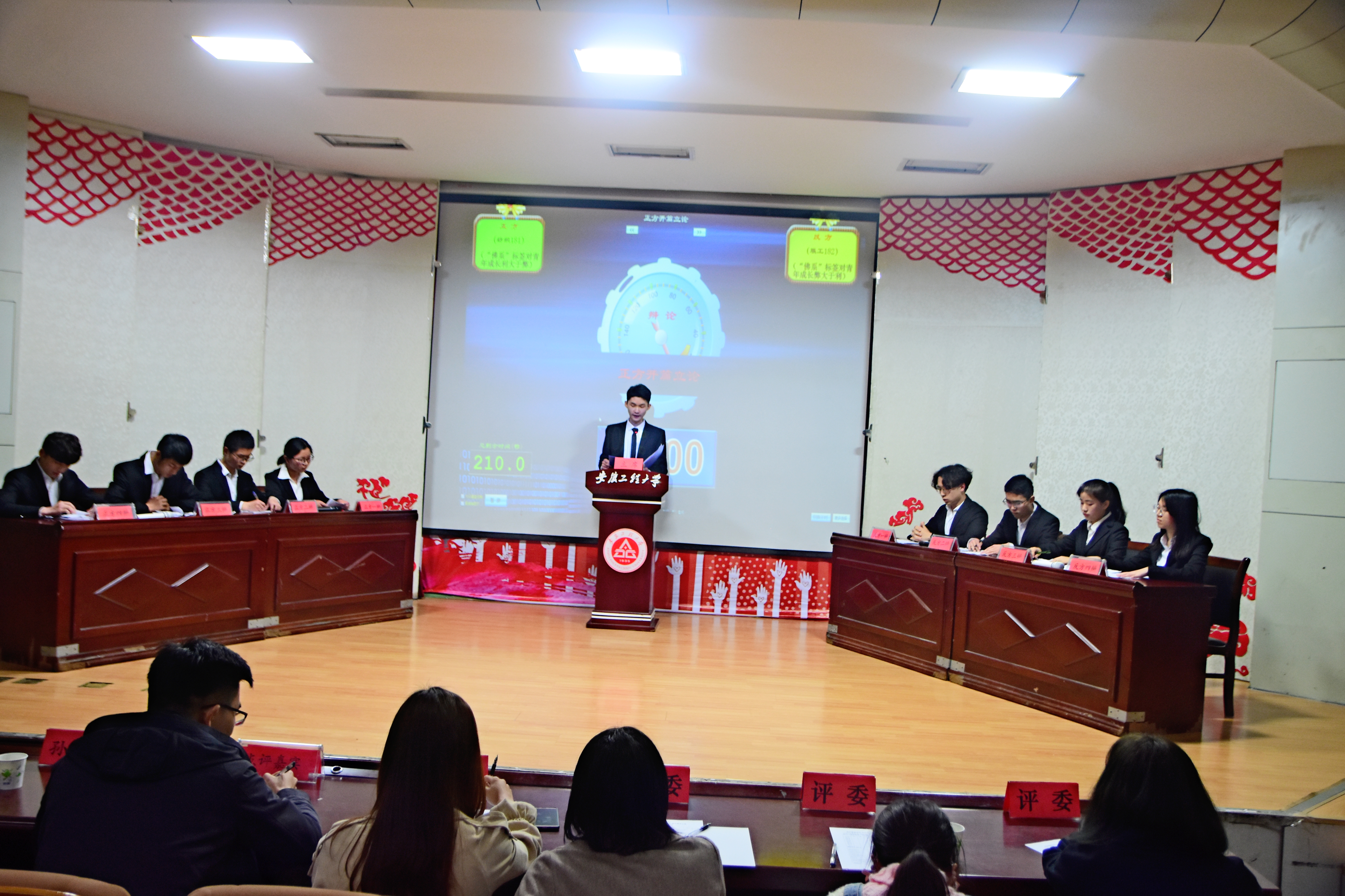 决赛开始前,播放了各个代表队的自我介绍以及班级同学对其成员加油的视频。第一场季军争夺战,正方纺织181班代表队与反方服工182班代表队,就“佛系标签对青少年成长是利大于弊还是弊大于利”展开了激烈的争辩。比赛过程中,双方辩手据理力争,引经据典,观点明确,时时爆出金句,观众席上不时响起阵阵掌声。中场休息环节,由本学院音乐组成员为我们带来歌曲《春风十里》,让选手暂时放松紧绷着的神经。第二场冠军争夺战中,正方纺织182班代表队与反方纺织183班代表队,就“新时代青年发展重在塑造人格还是重在知识积累”为辩题展开了激烈的辩论,辩论开始,双方选手都立场鲜明的阐述了本方论点,于你来我往间进行了精彩的唇枪舌战。观众提问环节,同学们积极发言,辩手们以敏锐的思维,出色的口才令现场观众所折服,激起激烈的掌声。最终,纺织183班代表队斩获冠军,纺织182班代表队,服工182班代表队分别获得亚军、季军。纺织183班的王云鹏同学获得最佳辩手称号。
