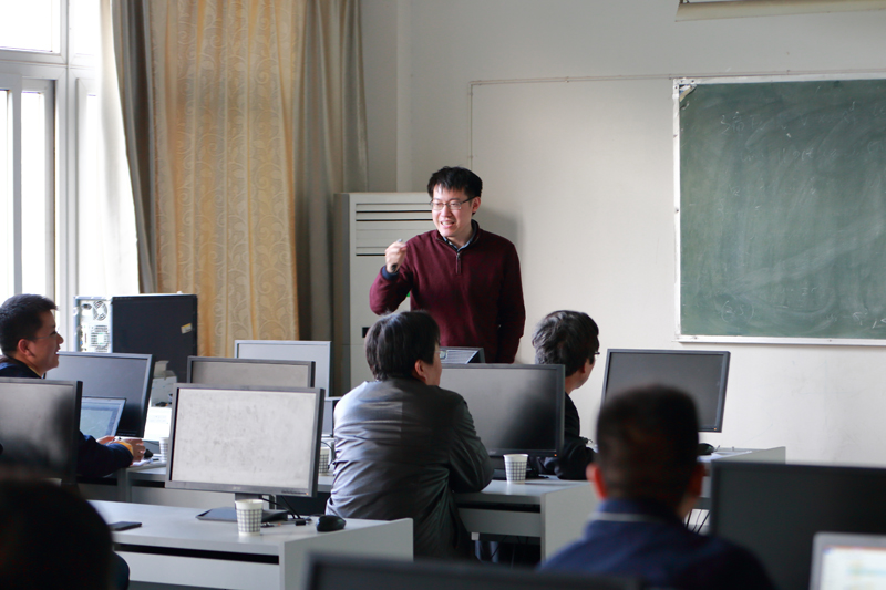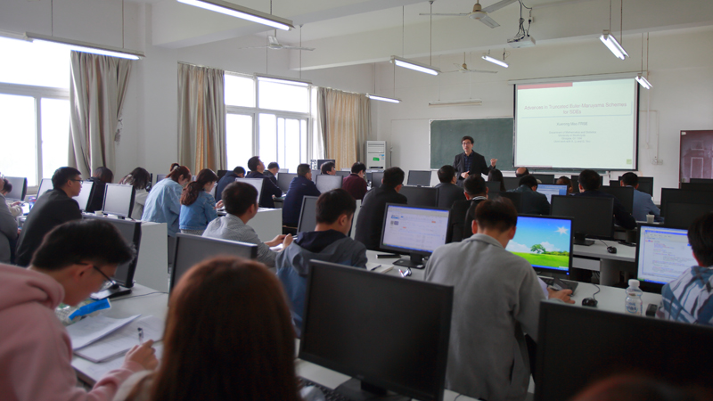 毛学荣在题为《Advances in Truncated Euler-Maruyama Schemes for SDEs》学术报告中,首先他对自己时变随机微分方程的研究工作做了总体概述。随后详细介绍了自己使用Truncated Euler-Maruyama的方法在局部Lipschitz条件下对随机微分方程的数值解与解析解的研究。并对相关的引理,结论等性质进行了仔细的分析证明,对一些关键问题的解决方法进行了讲解。报告过程中,毛学荣还对数理学院师生提出的问题进行了讨论和解答。