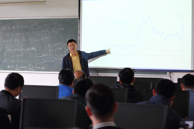 尤苏蓉和张振中分别做了《On Exponential Stability Of Hybrid Neutral Stochastic Differential Delay Equations with Different Structures》和《 Ergodicity for a Class of Stable Processes with Random Switching》的报告。在报告中尤苏蓉主要介绍了不同结构混合中立型随机微分延迟方程的指数稳定性。他首先向我们介绍了中立型随机微分方程的特点,中立型随机微分方程的稳定即依赖现在状态也依赖于过去,随后他介绍了方程的背景及指数稳定的证明。 张振中在报告中主要介绍了一类具有随机切换的稳定过程的遍历性,他首先详细介绍了遍历的含义,在电力运行、机械加工、大规模的劳动组织等生产过程中,常常会遇到这样的情况,即不管系统的初始状态如何,在经历了一段时问以后,系统就会处于统计平衡状态,这种情况就是数学中所谓的遍历性问题,遍历性问题是马氏链理论的一个重要部分。随后介绍了由稳定过程驱动的带有随机切换的SDEs的研究的一些主要结果。