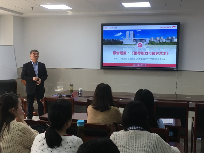 4月13日下午,应人文学院邀请,芜湖市人大常委会副主任、芜湖市总工会主席韩卫民,芜湖市委组织部副调研员刘金峰来人文学院做学术报告,报告会由人文学院院长刘军主持,人文学院2018级全体研究生、其他年级的研究生代表及部分教师参加了报告会。