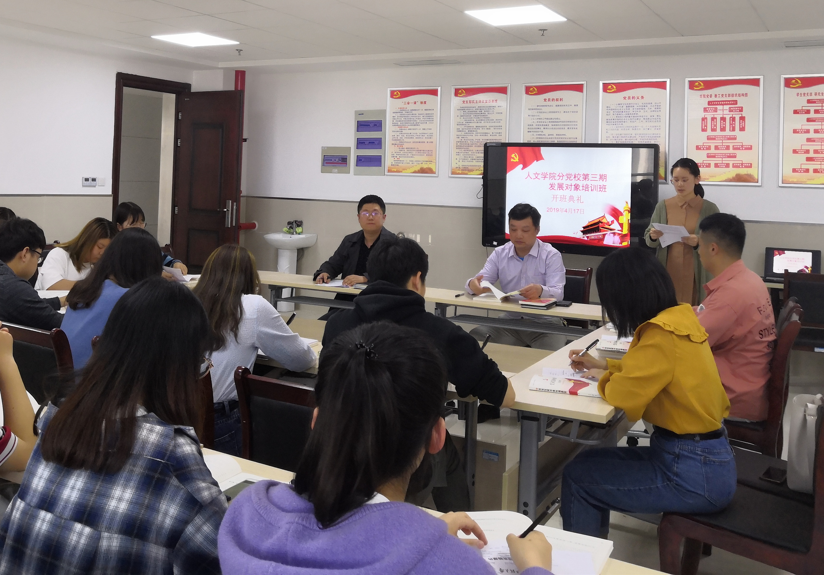为深入贯彻落实党的十九大精神,切实加强党的发展对象教育培养工作,保证新发展的党员质量,4月17日下午3:30,人文学院分党校第三期发展对象培训班开班典礼在人文学院党员活动室隆重举行。人文学院党委书记、分党校校长邓英扣,组织员刘海涛,本期培训班全体学员参加了开班式。