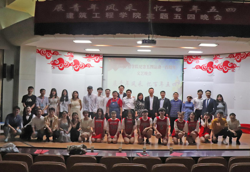 (本网讯)激扬青春,魅力五月。为纪念五四运动100周年,深入学习习近平新时代中国特色社会主义思想,激励广大青年发扬优良传统,弘扬五四精神,不忘初心跟党走,5月9日晚7时,建筑工程学院以“展青年风采,忆百年五四”为主题的五四文艺晚会在学术报告厅精彩上演。