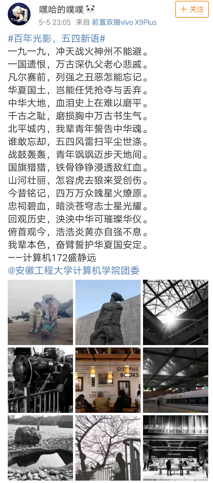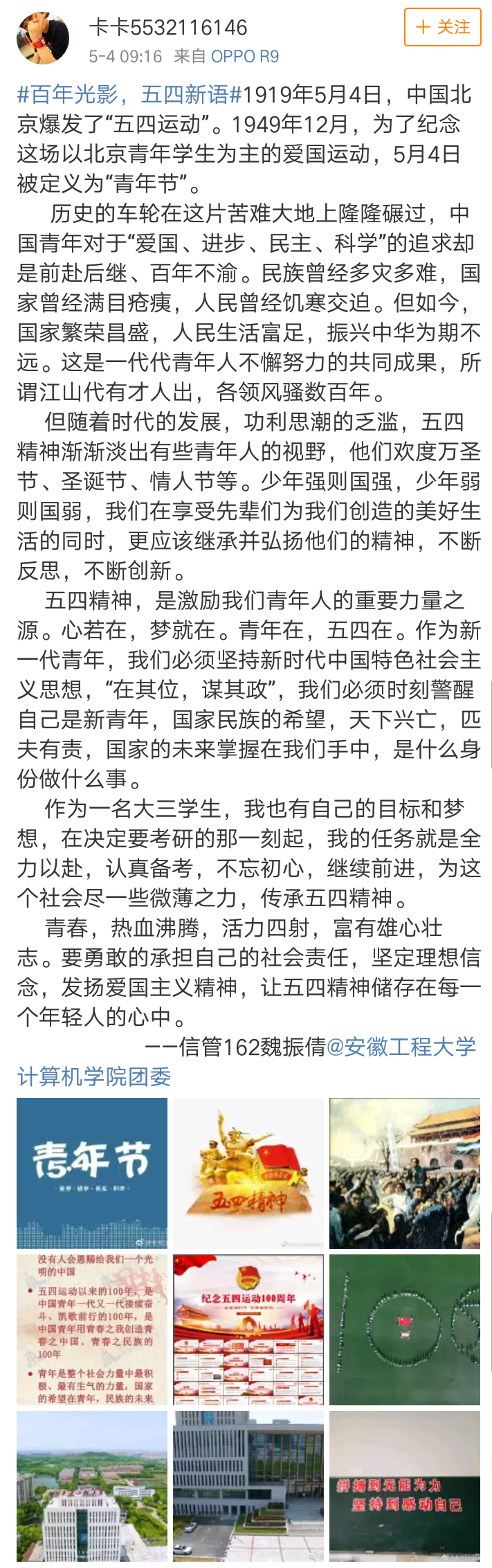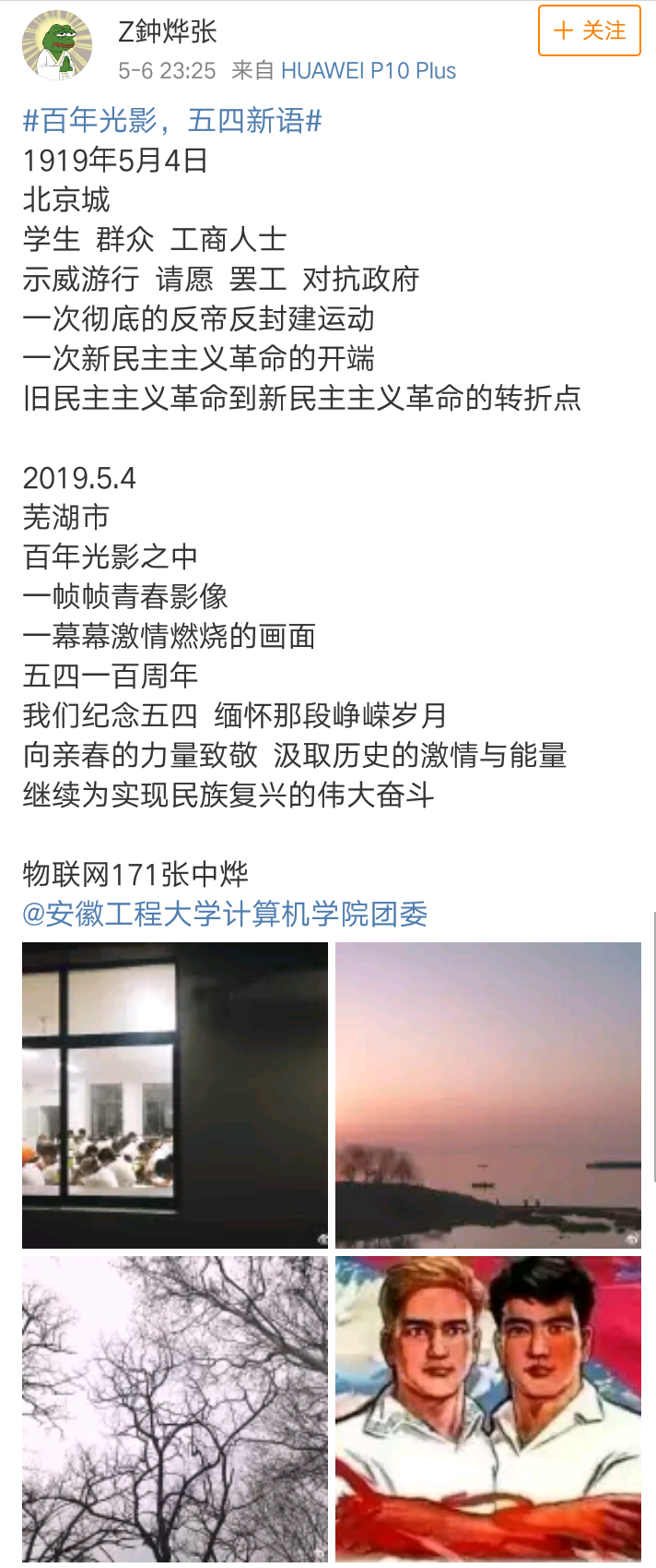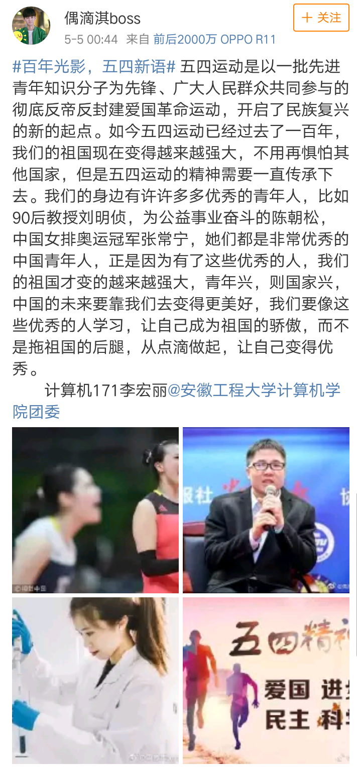 (本网讯)为纪念五四运动一百周年,继承和发扬共青团的光荣传统,进一步引导和激励我院广大团员青年传承“爱国、进步、民主、科学”的五四精神,计算机与信息学院团委于4月29日至5月6日组织开展了以“百年光影,五四新语”为主题的微博活动。全院120余名学生积极参赛。