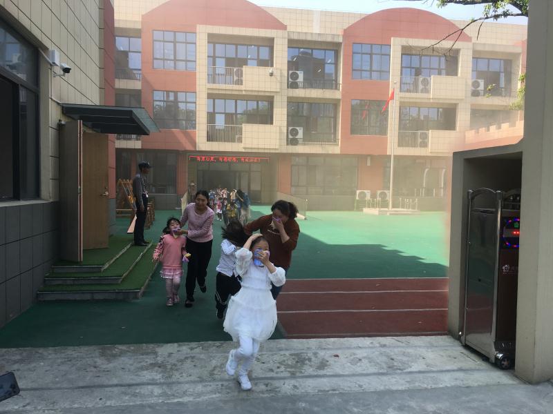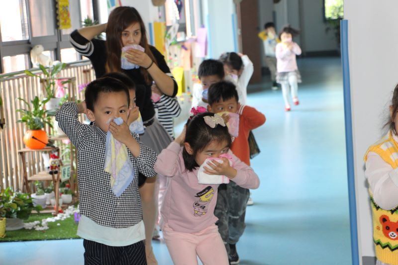 2点40分开始演练,保卫处老师到现场进行专业指导。演练共分避震和疏散两个环节,首先是应急避震演练,伴随着急促的地震警报声,孩子们在老师的组织下迅速保护头部躲到桌子底下避震。随后组织紧急疏散演练,老师们立即组织幼儿排好队,用湿毛巾等捂住口鼻,弯着腰,手扶楼梯的栏杆,很快疏散到室外安全空旷的场地。整个过程紧张而有序。