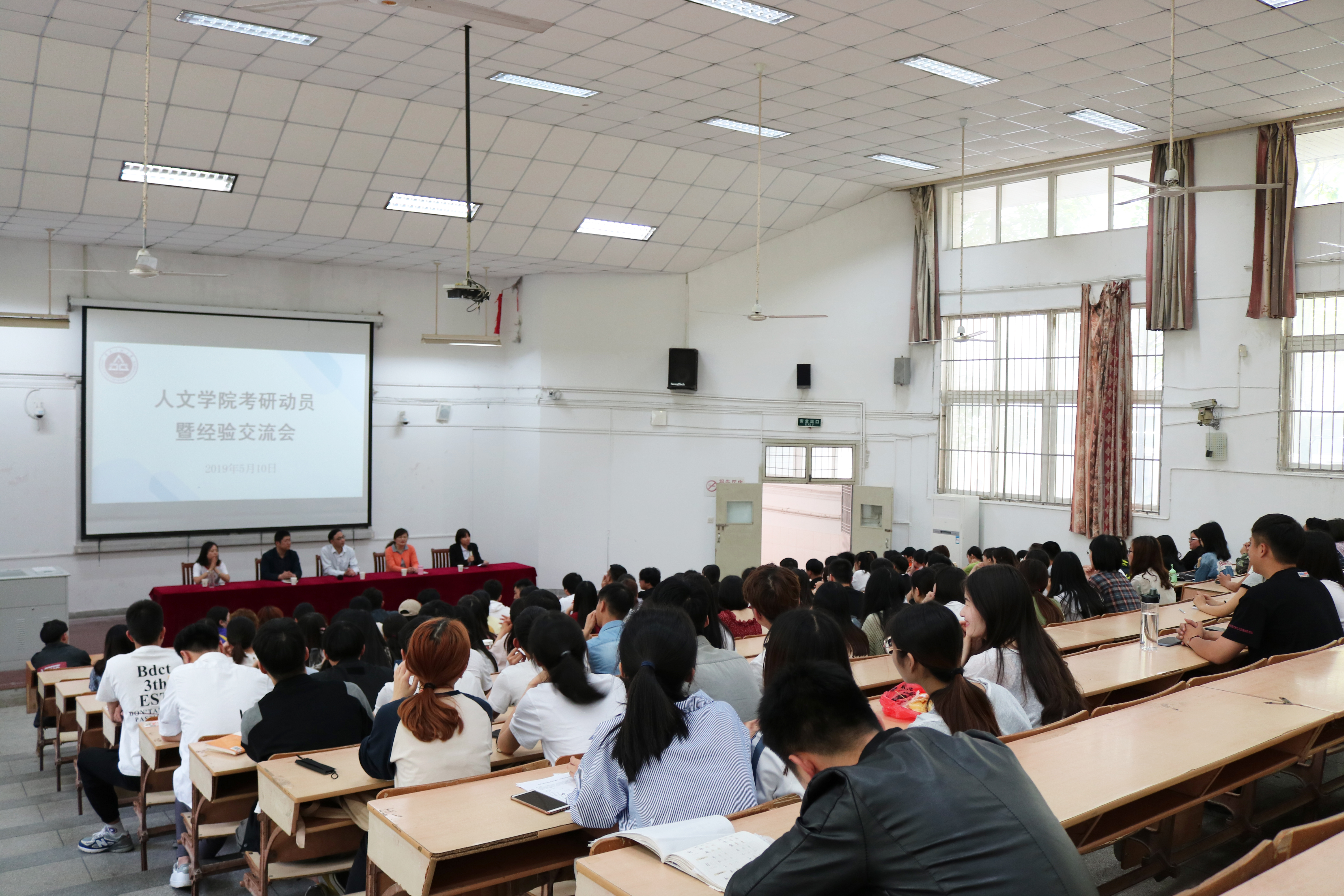 (本网讯)5月10日下午,人文学院分专业在2教报告厅和2教106举办考研动员暨经验交流会。院长刘军、党委副书记金艾裙及200余名师生共同参加会议。
