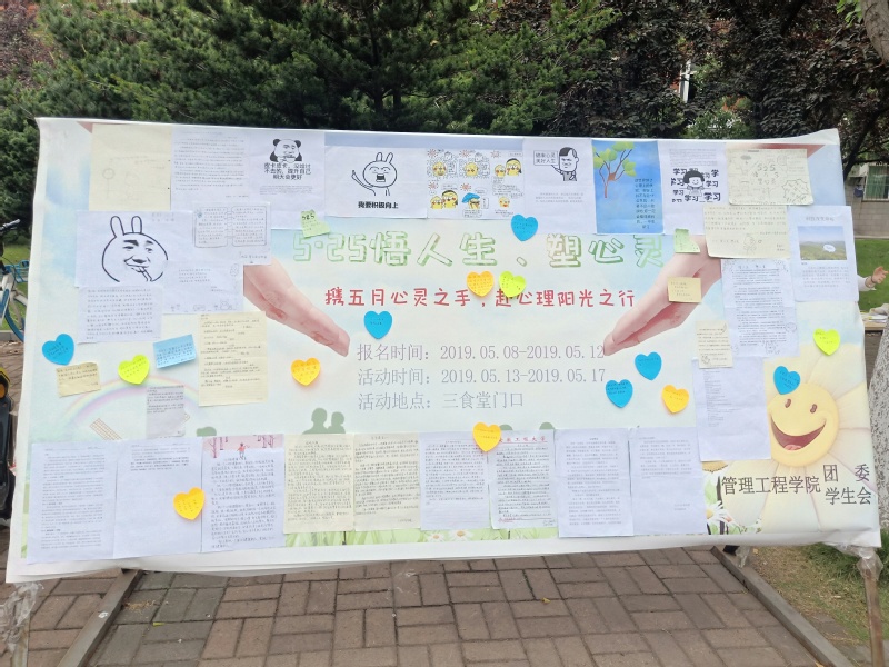(本网讯)为呼吁大学生关注自身心理健康,增强心理保健意识,塑造积极、健康、乐观的阳光心态,管理工程学院于五月中旬举办了“悟人生 塑心灵”5·25心理健康活动。