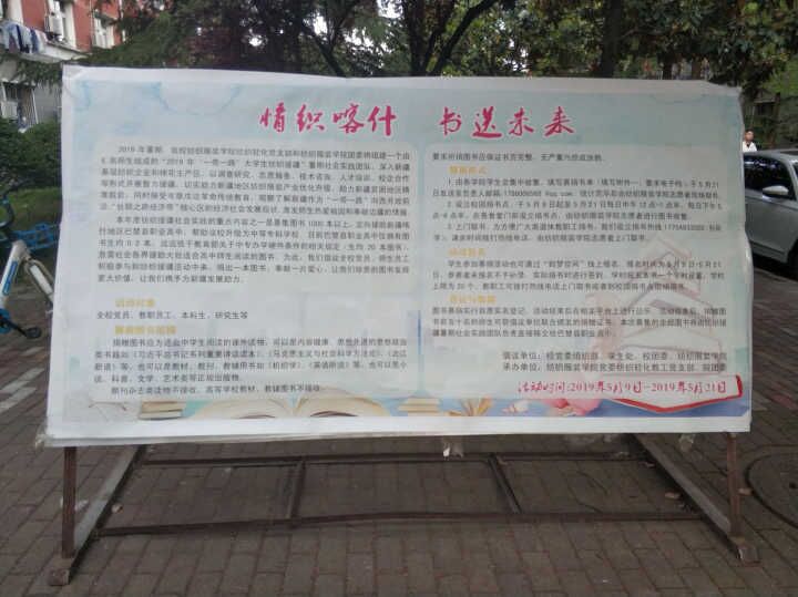 (本网讯)5月9日至21日,纺织服装学院组织开展的“情织喀什书送未来”图书募捐活动在校园内如火如荼的开展。此次图书募捐是纺服学院暑期社会实践团队智力援疆的一项重要组成部分,募捐来的图书将定向援助新疆喀什地区巴楚县职业高中,帮助该校升级为中等专科学校。