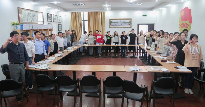 群团党支部书记郭广春带领全体师生党员面向党旗,立正身姿,紧握右拳,激昂澎湃地重温入党誓词。
