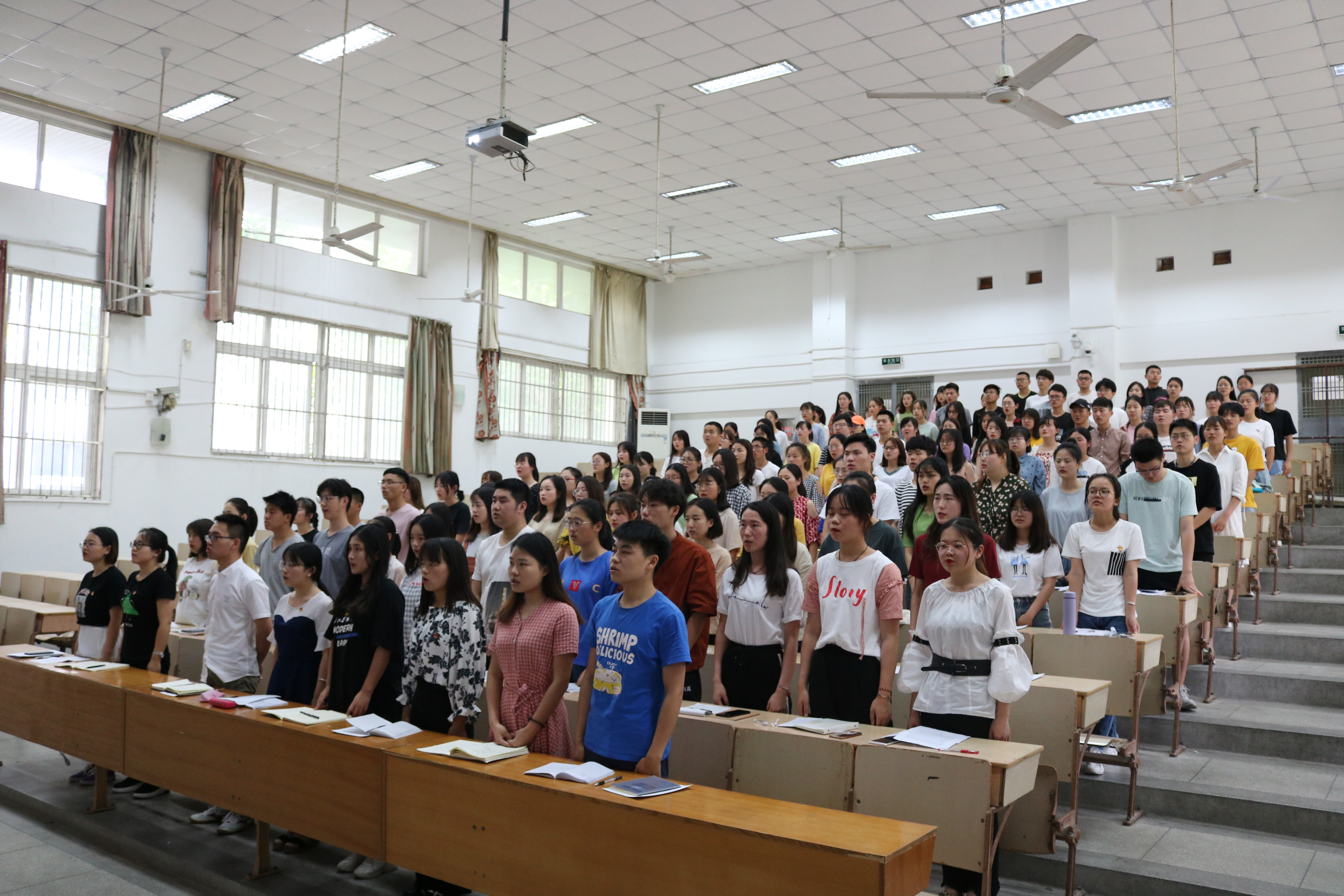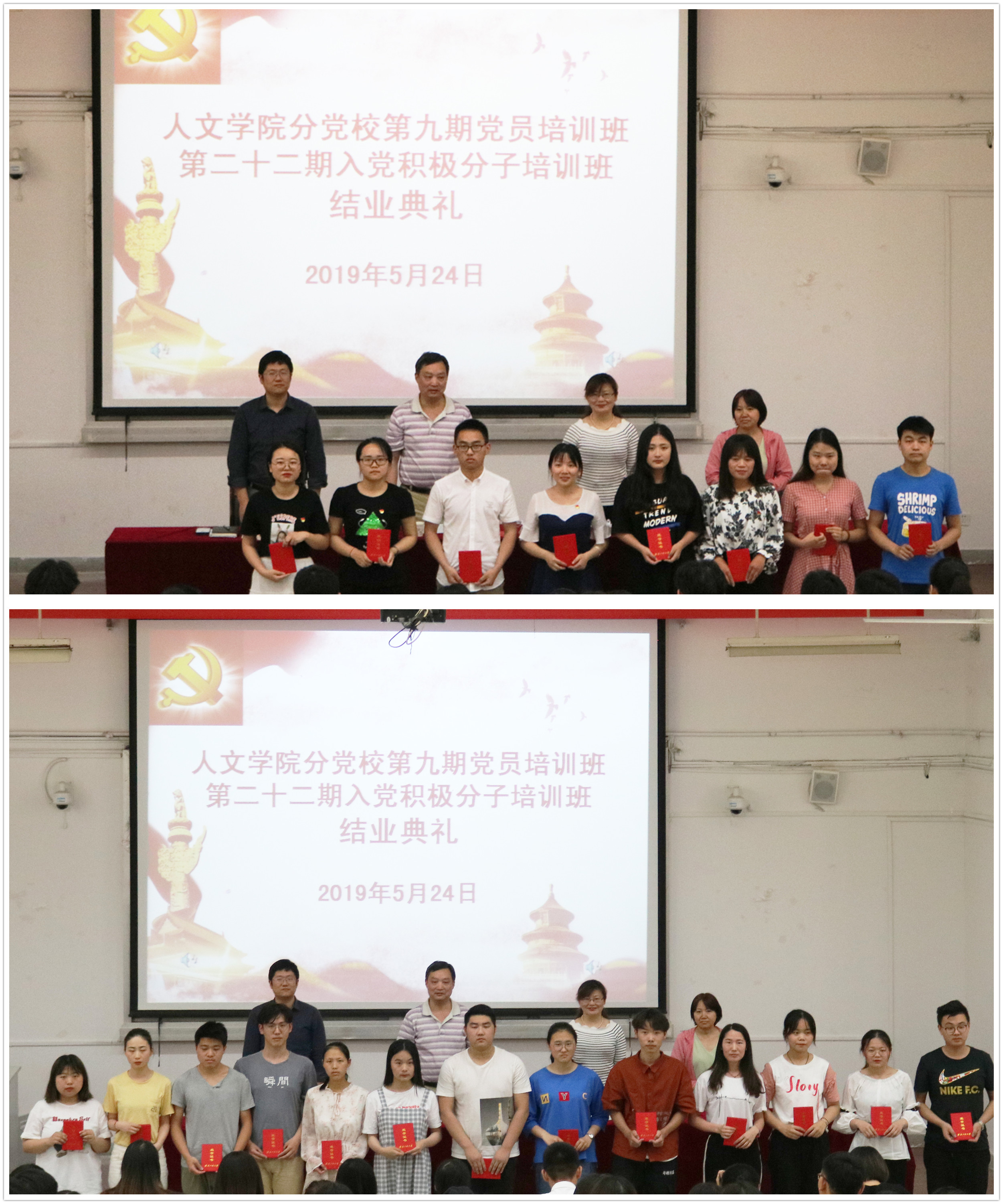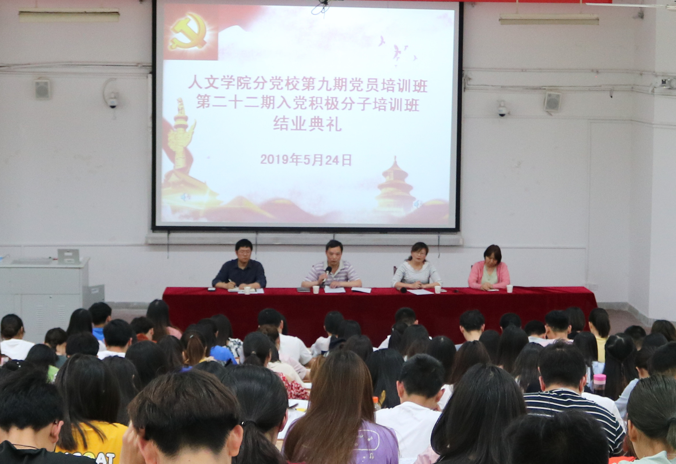 (本网讯)5月24日下午,人文学院分党校举行第九期党员培训班、第二十二期入党积极分子培训班结业典礼。人文学院党委书记邓英扣等130余名师生出席典礼。典礼由人文学院党委副书记金艾裙主持。