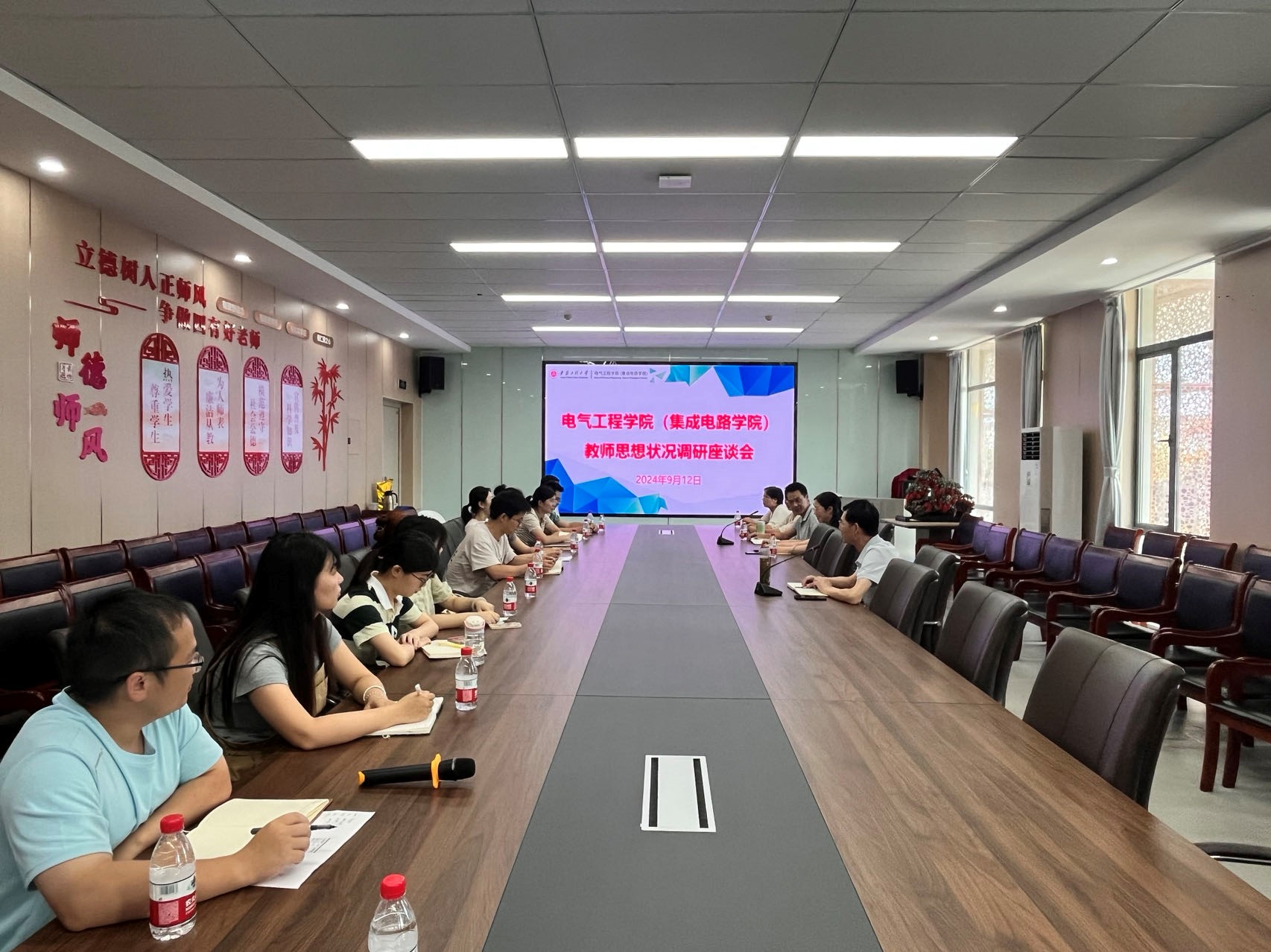 本网讯为庆祝第40个教师节,增强电气工程学院(集成电路学院)教师的凝聚力,营造尊师重教的浓厚氛围,9月12日,学院在国际工程师校区龙胜楼206会议室召开新老教师思想状况调研座谈会。会议由学院党委书记杨会成主持,各系部老教师代表及近两年入职博士教师参加了座谈会。