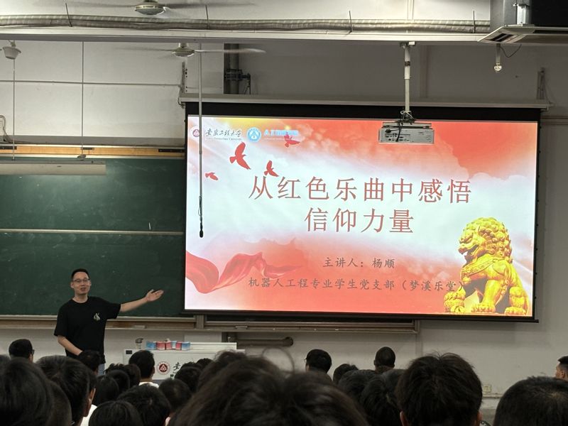 本网讯为做好新生入党启蒙教育,加快构建同向同行、互融互通、共建共享的“思政+美育”协同育人模式,以美育人、以文化人,着力增强育人实效。9月10至12日,人工智能学院党委在6教214举办“从红色乐曲中感悟信仰力量”美育思政专题讲座。讲座由机器人工程专业学生党支部书记杨顺主讲,2024级全体新生参加。