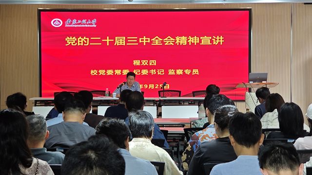 程双四从党的二十届三中全会是在以中国式现代化全面推进强国建设、民族复兴伟业的关键时期召开的一次十分重要的会议,深入学习领会习近平总书记在党的二十届三中全会上的重要讲话精神,全面准确理解《决定》提出的进一步全面深化改革重大举措,全力以赴抓好全会精神贯彻落实等四个方面进行深入宣讲和系统阐述。他指出,学习贯彻落实党的二十届三中全会精神,全体教师要有更高的站位、格局和情怀,舍私利、甘奉献,学院的学科专业方向要与学校和国家发展需求相关联;学院领导班子要有长远谋划,看的远、谋大局,充分发挥学院在设计领域现有的影响力,加强教师队伍建设,全面提高人才培养能力,做好新时代育人工作;学院上下要积极主动作为,紧密对接企业,增强沟通合作能力,深挖社会服务潜力;学院师生要严守底线,遵规守纪,严守中央八项规定精神,强化师德师风建设,对年轻干部要加强教育管理监督。