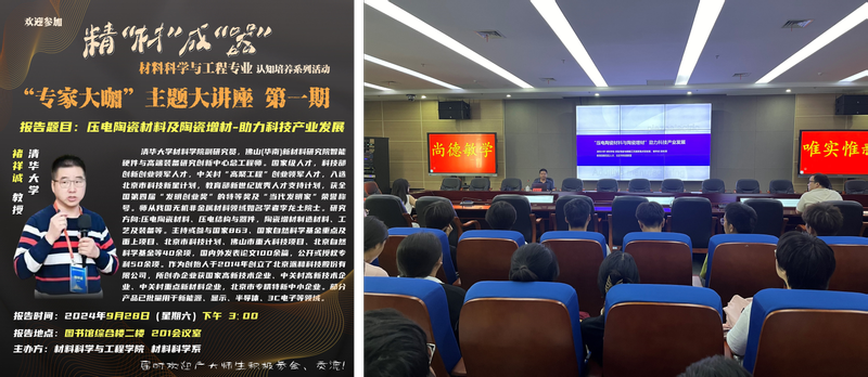 本网讯为了深化2024级新生对所学专业的认识和理解,提高他们的专业素养和水平,材料科学与工程学院开展“精”材成“器”材料科学与工程专业认知培养系列活动,并于9月28日召开第一期“精”材成“器”“专家大咖”主题讲座。本次活动邀请清华大学褚祥诚教授做“压电陶瓷材料及陶瓷增材-助力科技产业发展”主题讲座,并给材料科学与工程专业大一新生上第一次专业导论课。材料学院院长左如忠、材料科学系全体教师、材料科学与工程专业大一新生以及部分大二学生参与本次活动。