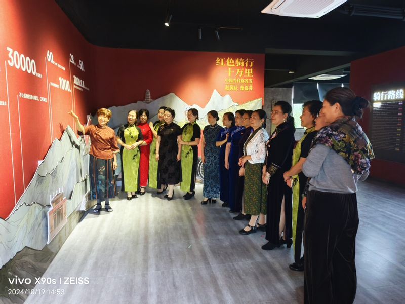 在红色骑“迹”体验馆,旗袍协会曹锦芬老师亲自为大家介绍了她和丈夫赵国庆老师从2008年8月8日至2020年8月8日历时13年,骑经全国34个省级行政区(含自治区、省辖市、港澳台),269个地级市,1087个县,参观瞻仰815个红色景点,骑行总里程达104986里(相当于4个25000里长征)的感人故事。
