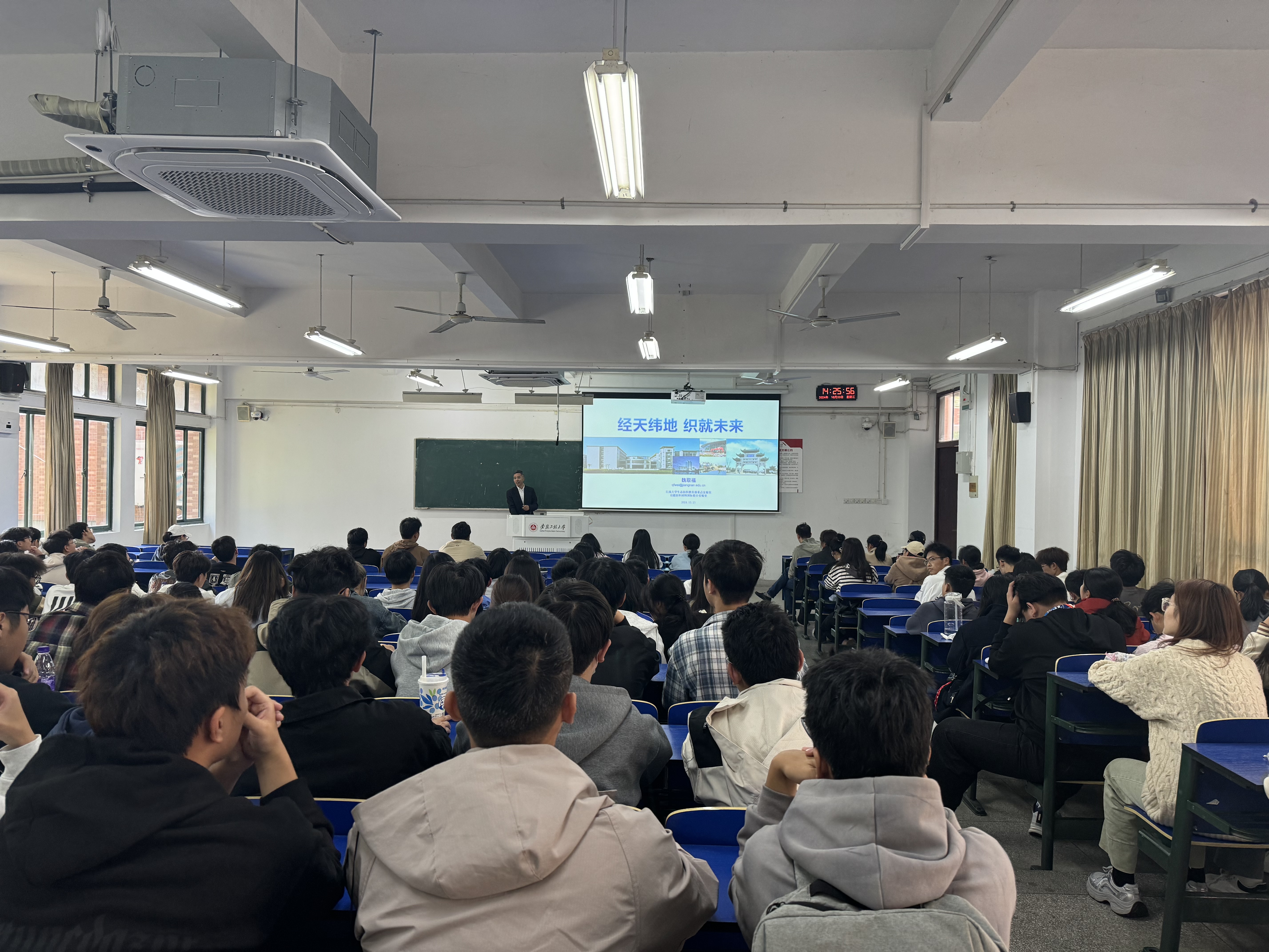本网讯10月23日,江南大学博士生导师魏取福教授应邀为纺织服装学院24级纺织工程、非织造材料与工程、服装设计与工程专业学生作“经天纬地 织就未来”专题讲座,讲座由副院长陶旭晨主持。