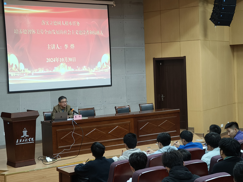 本网讯为进一步落实落细“三抓”工作要求,推深做实“三全六专”育人实践,坚定理想信念,加强品德修养,促进学生全面发展,10月30日,建筑工程学院党委书记李烨应邀在C座3楼报告厅为第八期“青马工程”培训班学员、团学组织学生干部、青年学生代表作题为《落实立德树人根本任务 培养德智体美劳全面发展的社会主义建设者和接班人》的专题报告。