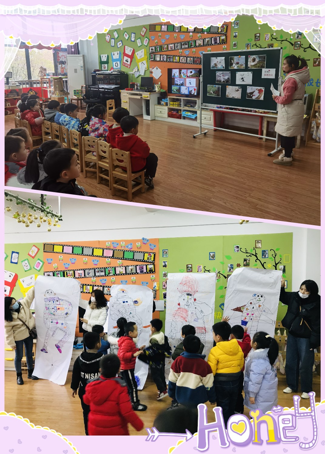 夏老师将“木头人”游戏融入到美术活动《我乐秀》中来,鼓励幼儿大胆地表演,并分工合作在大大的画纸上一起用线条和花纹进行加工和装饰,孩子们配合默契,完美的呈现了他们眼中的世界。整个活动,丰富多彩,老师准备充分,组织有序,采用互动教学,启发教学,小朋友们在潜移默化中学到了知识,懂得了道理。大家齐心协力,共同合作,忙得不亦乐乎。