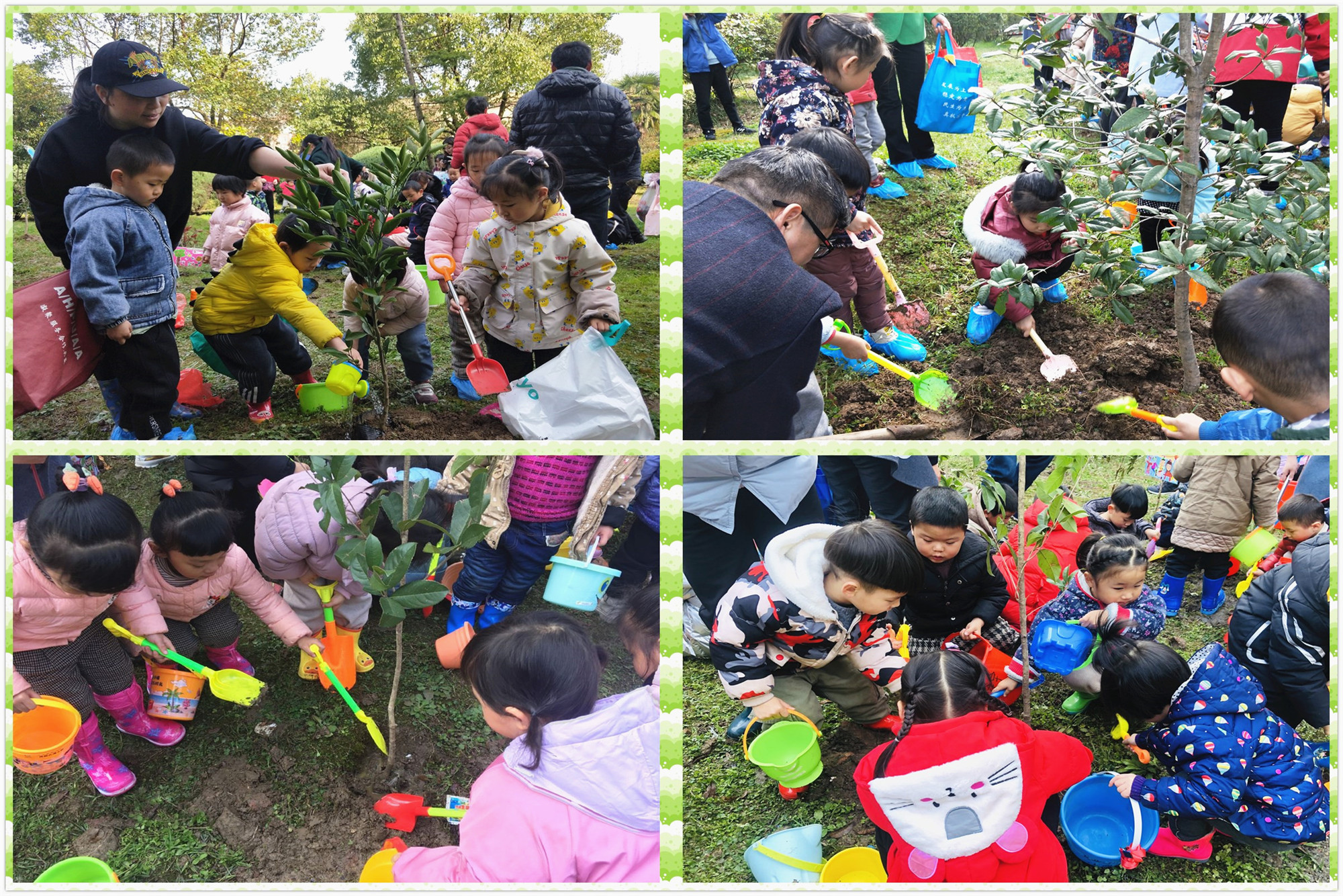 3月10日上午,孩子们由老师和家长陪伴着,带上小树苗和工具,排着整齐的队伍来到了植树地点开始植树活动。在大人们的指导和帮助下,孩子们扶苗、培土、踩压、浇水,分工合作、配合默契,亲身体验到了劳动的乐趣,脸上都洋溢着快乐的笑容。最后他们为每一棵小树挂上了“量身定制”的认养卡,和小树一起拍照留影,约定着伴随小树一起长大,家长们纷纷用手机留下了这美好的时刻。