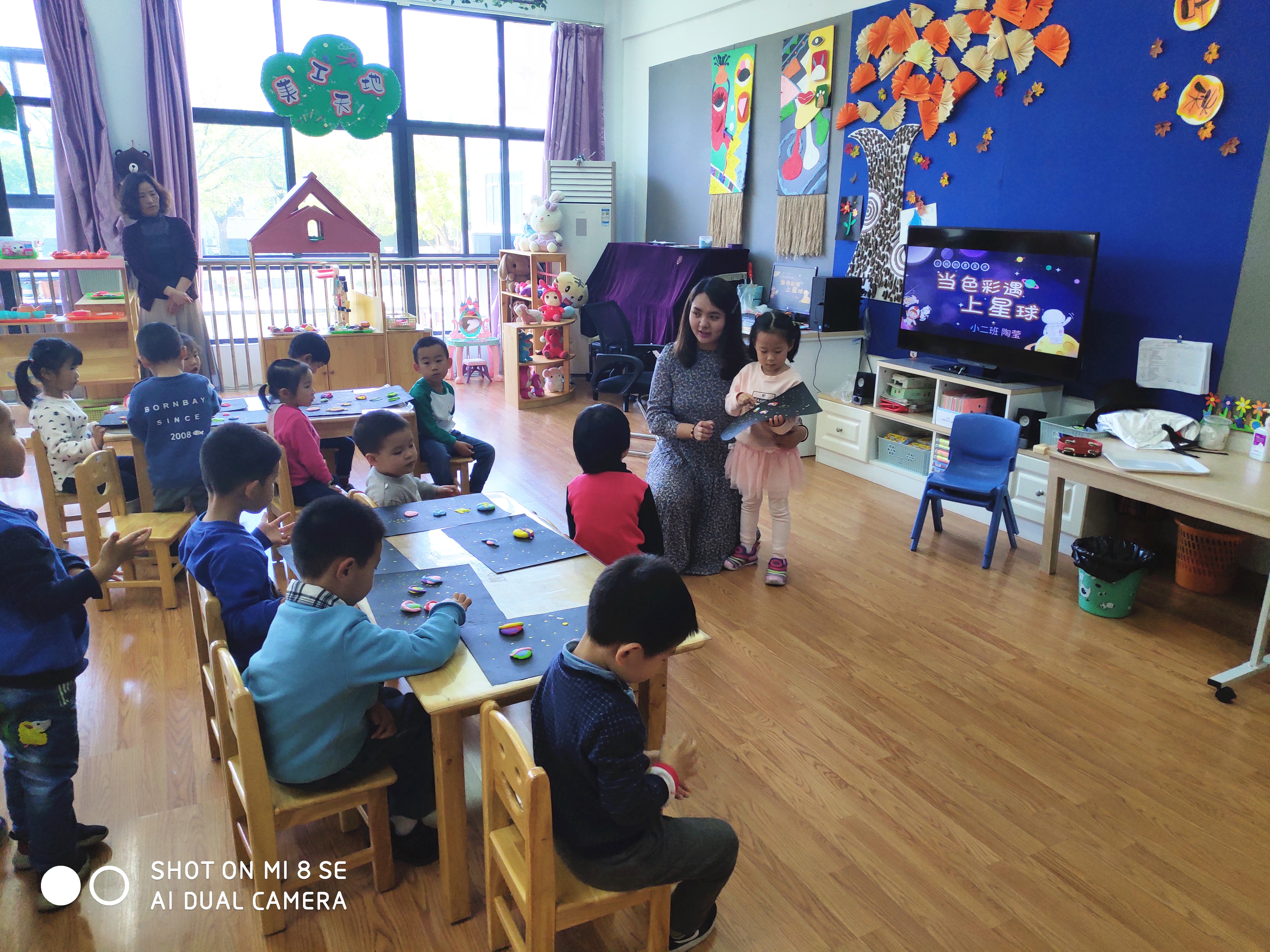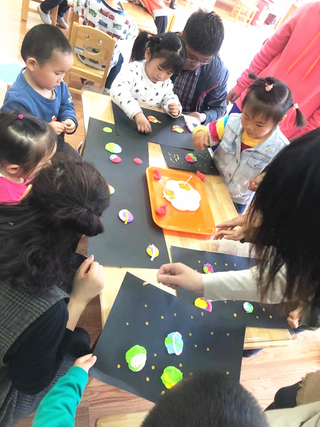 在音乐活动《挠挠小怪物》上,伍老师“变身”为一名“魔法师”,带领幼儿学习“挠痒痒变动物”的本领,孩子们一边学着“挠一挠”动作,一边体验着亲子游戏“魔法变变变”的乐趣。接着,陶老师通过有趣的宇宙知识导入了美术活动《当星球遇到色彩》,结合幼儿对星球的认知,鼓励幼儿大胆尝试运用混色、团圆、搓条等技能,用各色黏土制作星球,并让幼儿初步学会用棉签进行点画,自由创作夜晚的星空,孩子们在创造“美”中收获了快乐与成功。家长们在观摩幼儿游戏活动时都流露出欣慰的笑容。