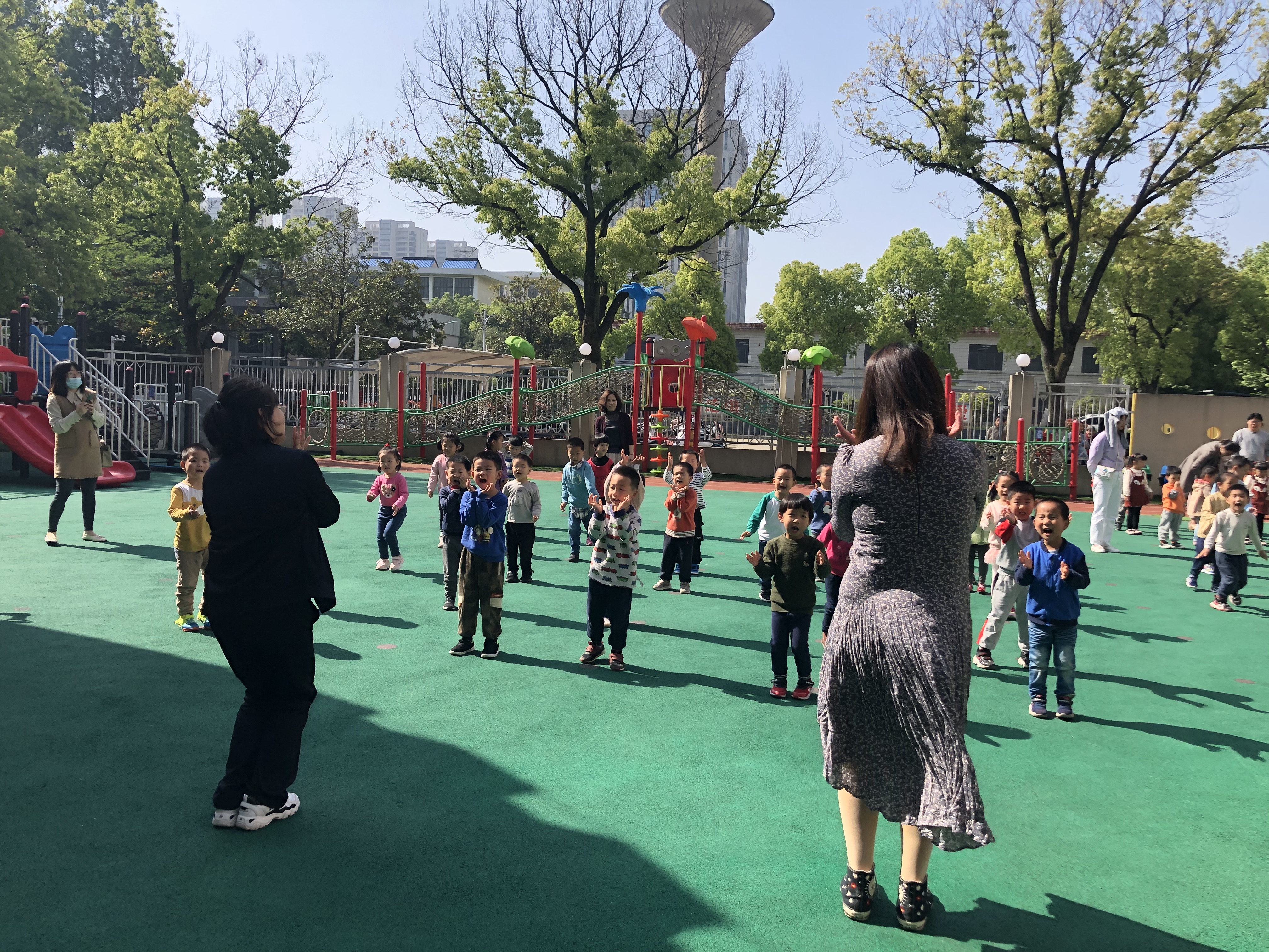 伴随着早晨阵阵清脆的鸟鸣声,家长和小朋友们陆续来到幼儿园,丰富多彩的晨间游戏开始啦!搭积木、趣味亲子剪纸、商店买买买等区角活动格外受欢迎。瞧,两列整齐的 “小火车”来到一楼操场上熟练排好队形,在欢快的早操音乐伴奏下,孩子们伸伸手、弯弯腰、扭扭胯、踢踢脚,开心地跳着、笑着,都想把最棒的自己展示给爸爸妈妈们看。