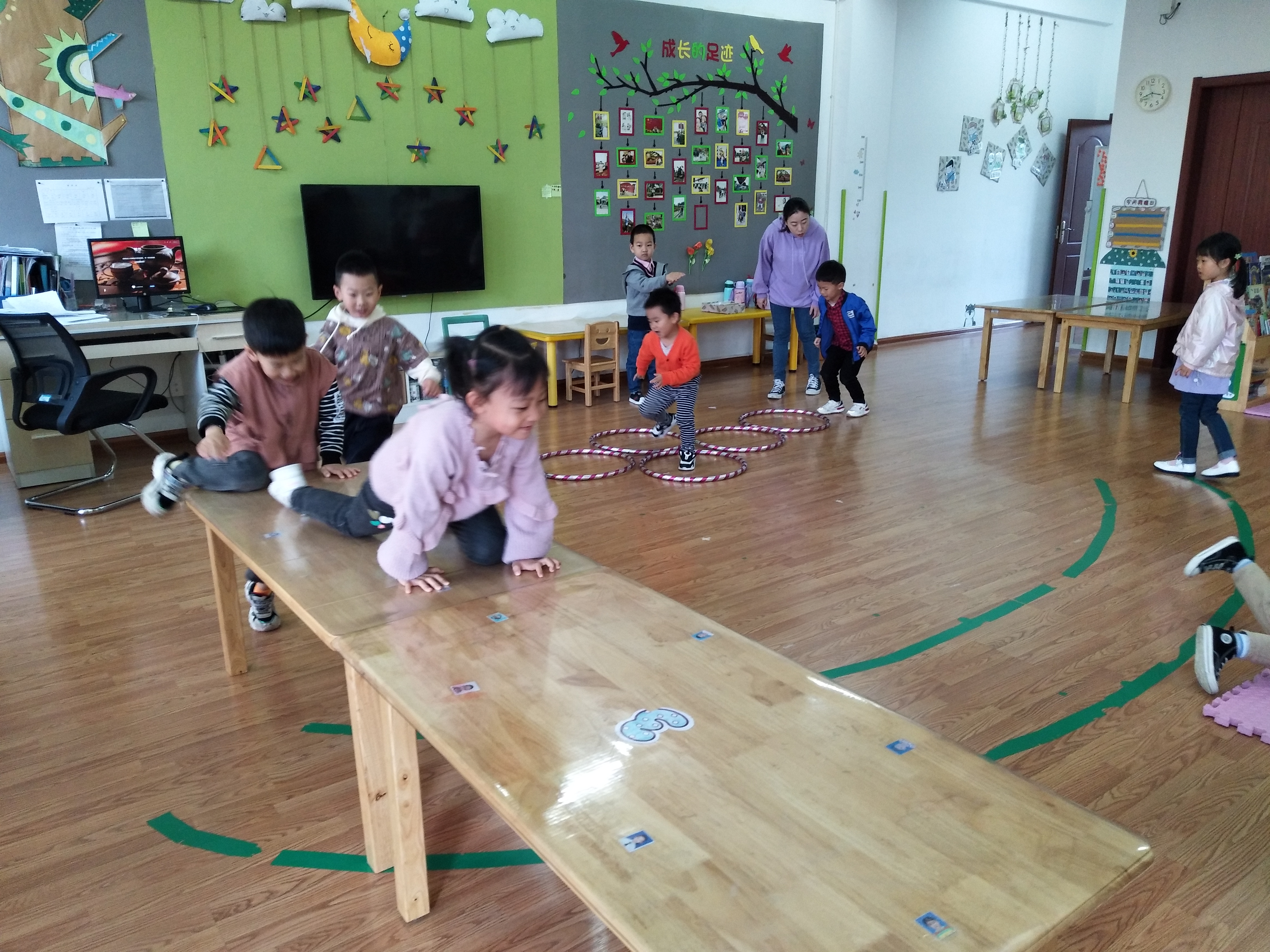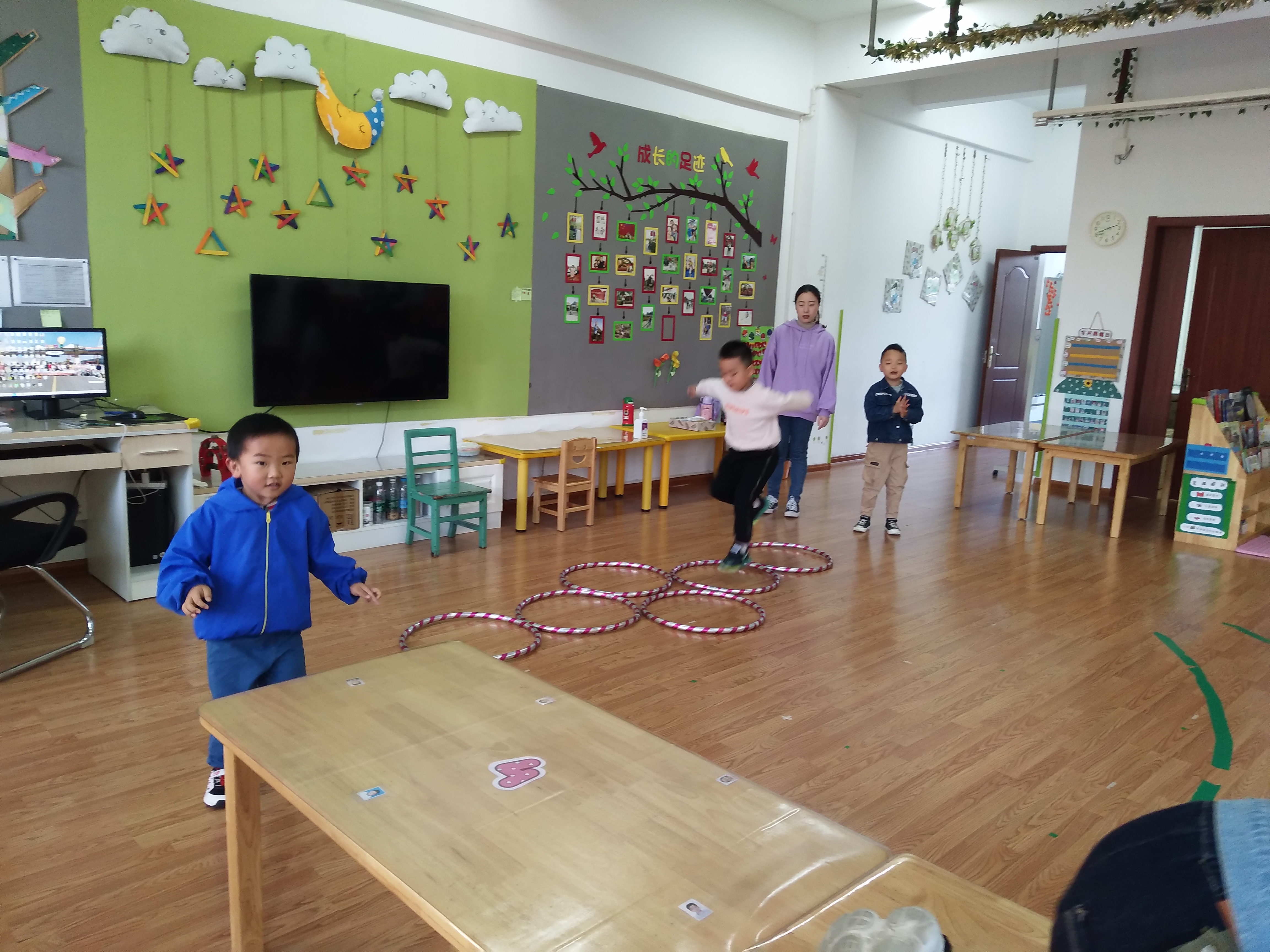 开放日活动在有趣的晨间活动中拉开了序幕。我班充分利用活动室空间和物品,布置了“闯关游戏”。游戏一共分为三关,分别是“小兔跳跳”、“我是小勇士”、“滚草地”。在游戏中发展幼儿单、双脚跳、爬行、翻滚的能力,提高幼儿动作的灵活性、协调性。小朋友们玩得开心极了。
