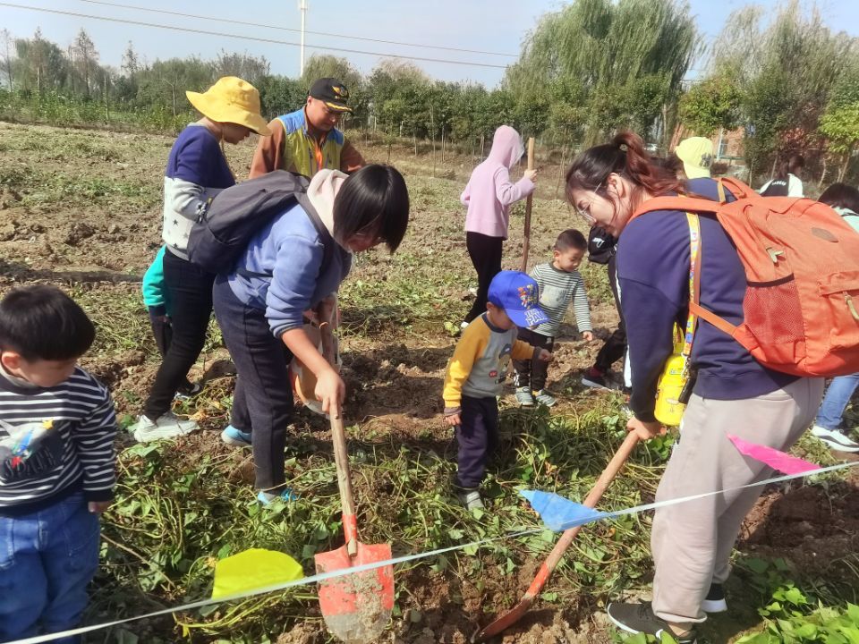 收完稻子后,家长和小朋友席地而坐,开始了户外午餐。辛勤的劳动和可口的饭菜让小朋友们胃口大开,一个个争着抢着要添加饭菜。午餐过后大家稍作休息就开始了挖红薯的活动,孩子们个个兴高采烈,跃跃欲试。一声令下,原本沉寂的田野沸腾了,大家开始埋头苦“挖”,有的用耙子刨,有的用手扒,大多数孩子都是第一次看到生长在田地里的红薯,当看到红薯从土里冒出尖尖角的时候,惊奇和喜悦之情溢于言表,田野里充满了“哇哇哇”的叫声。孩子们还决定回家后用红薯做出美味的红薯饭,体验一把自己动手,丰衣足食的快乐。