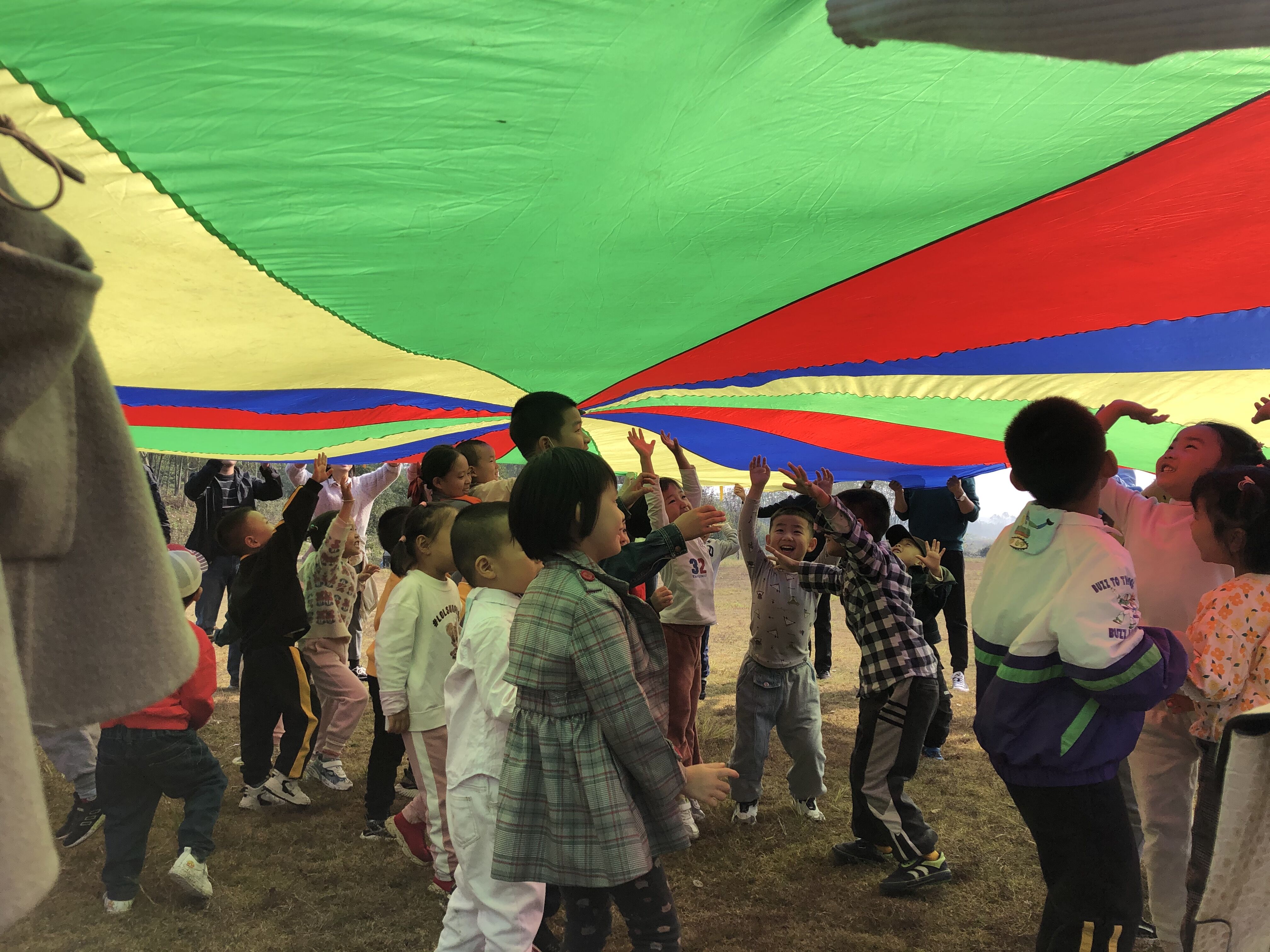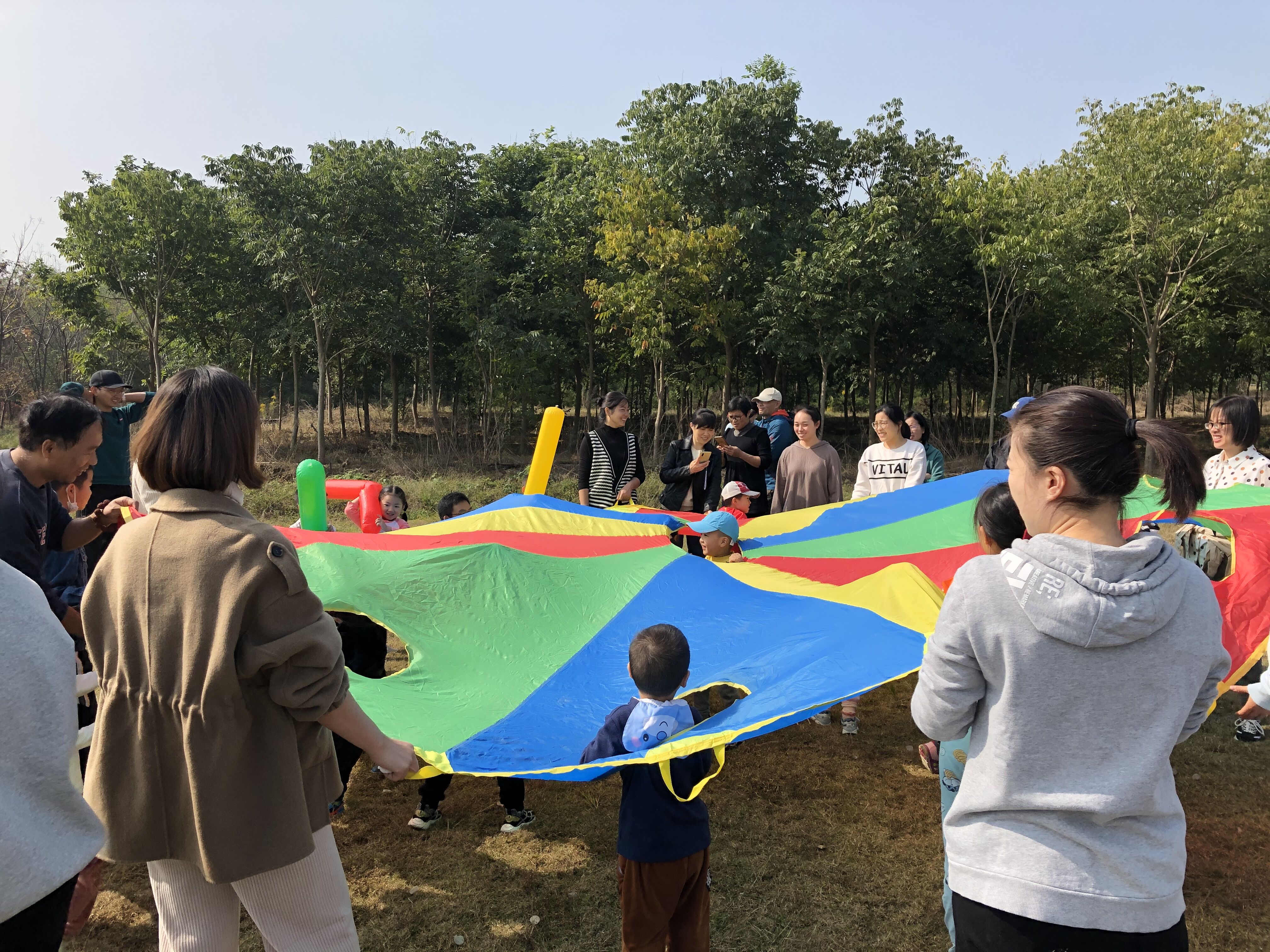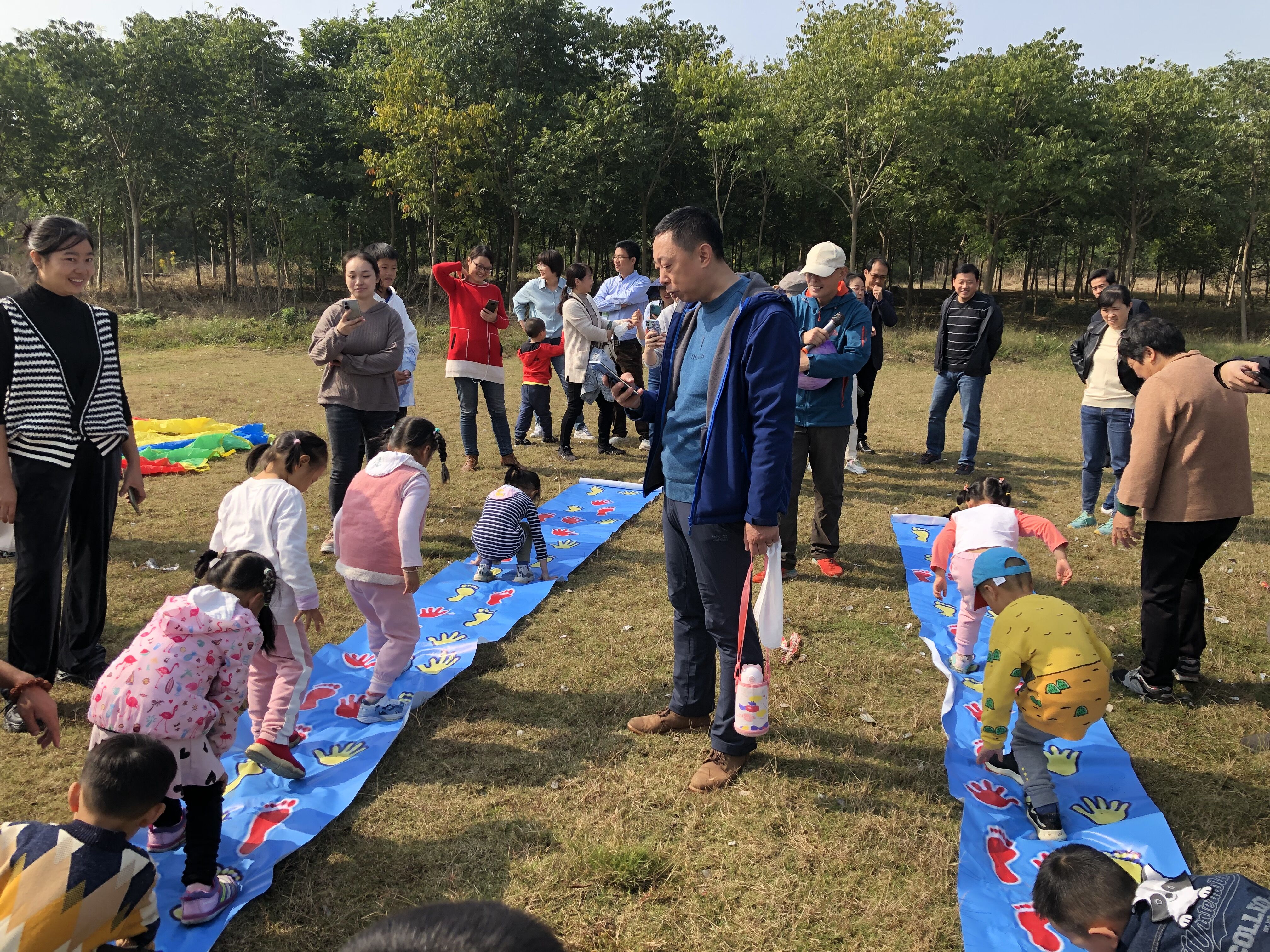 首先,在空旷的草地上开始了体能拓展训练,伸伸胳膊踢踢腿,动感的节奏伴随着温暖的阳光,大家都热情高涨。“彩虹伞”游戏是孩子们所熟悉的,在美丽大伞的“保护”下,“小调皮”们分组玩起了打地鼠和抛接球,紧张又激烈;在“手忙脚乱”游戏中,大家手脚并用,不断挑战自己,到达终点后,一个个举起小手高呼:“真是太好玩了”!“野餐”时间到了,宝贝们忙着分享着各自带来的食物,一声声礼貌的道谢让“同学情”更加深厚。之后,精彩的游戏一个接着一个:在“萌宠乐园”喂食小动物、坐上奔跑“动力小火车”、走上“小小木吊桥”……亲子活动走向高潮。在享受了一顿美味的午餐后,孩子开始挑战彩虹滑道。瞧,一个个跃跃欲试,勇敢自信,坐在滑板上兴奋的欢呼尖叫着从坡顶滑向地面!秋叶粘贴画是亲子活动的最后一个环节,孩子们收集着各种各样的落叶,在和爸爸妈妈创作的同时感受着大自然的神奇与美好。