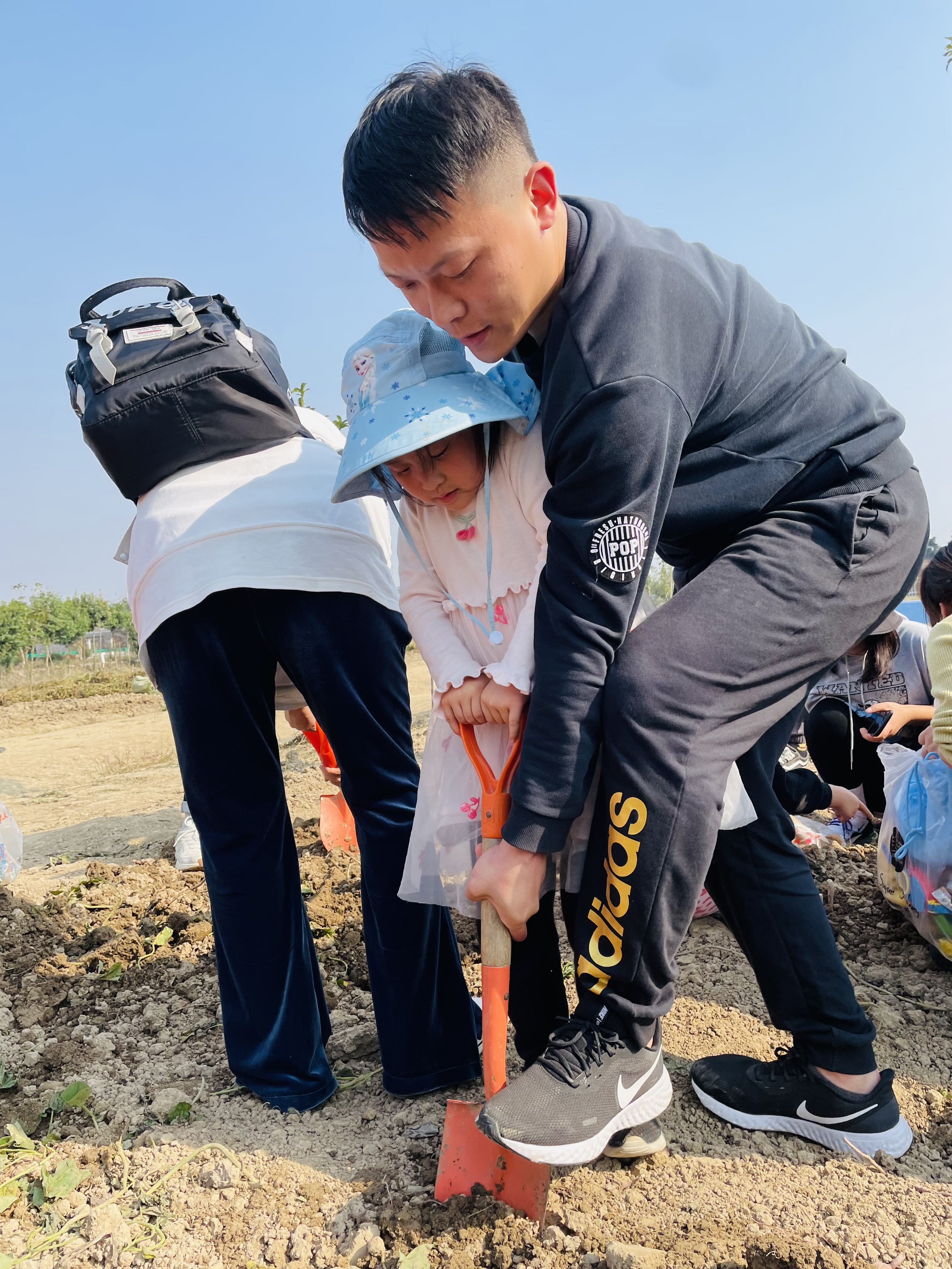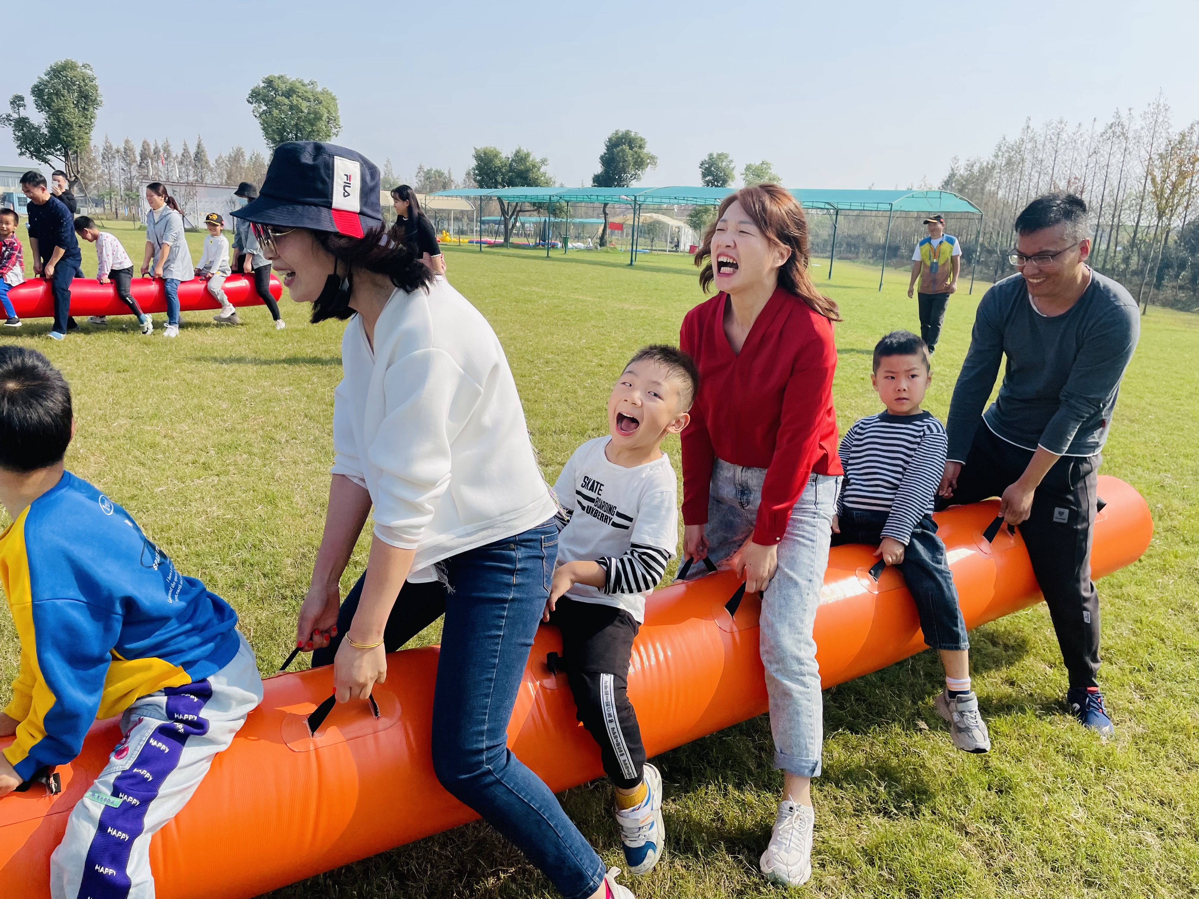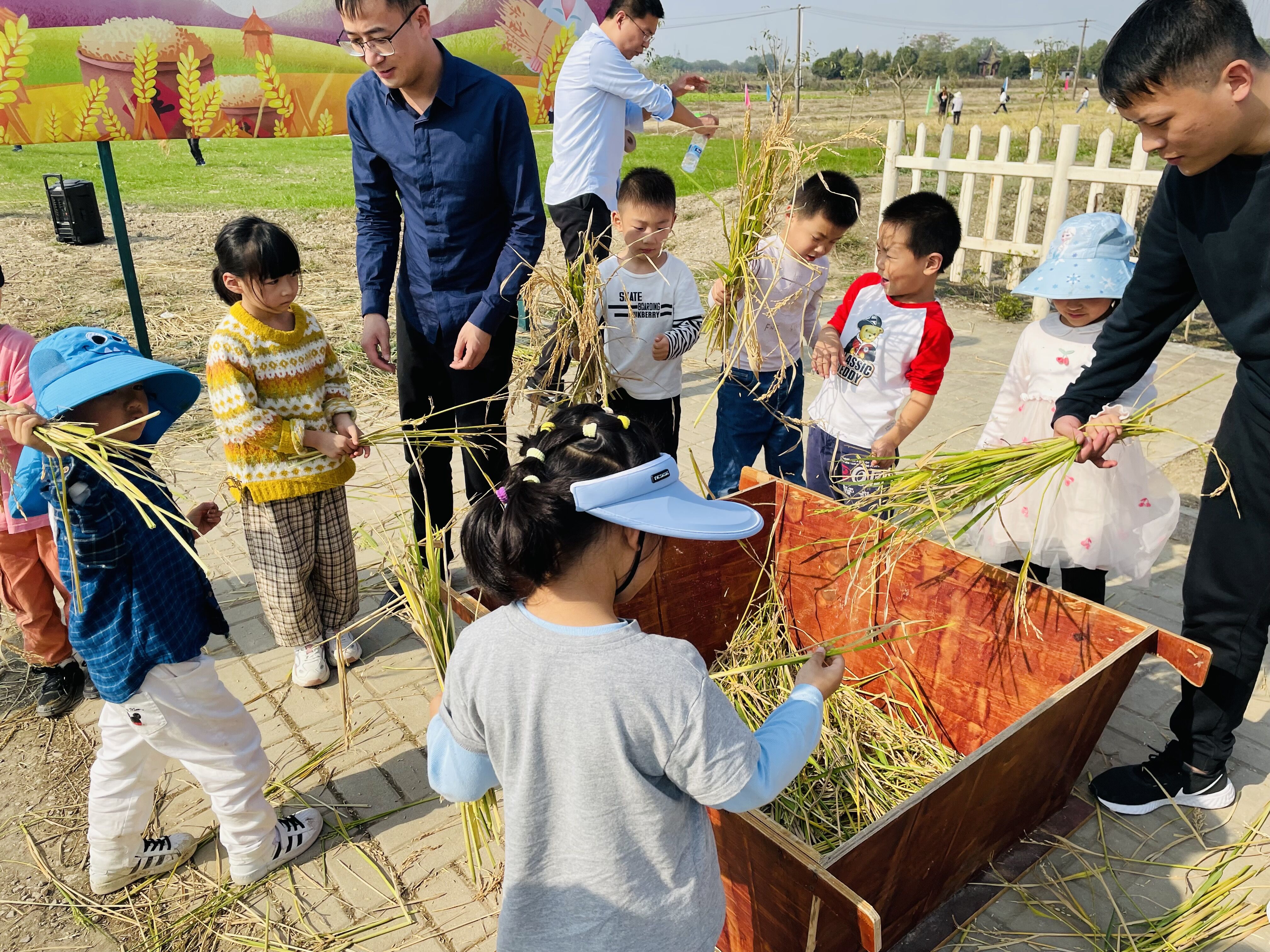 你看,“毛毛虫赛跑”比赛开始了,草坪上分成两队的爸爸妈妈和小朋友们一起抬起充气毛毛虫向前冲,一旁“加油!加油!”的呐喊声响彻云霄;你看,“蔬菜套圈”游戏开始了,小朋友们一个个聚精会神的扔圈圈套蔬菜,“我套了土豆”、“我套了白萝卜”、“我还有大柚子呢”,欢快的嬉笑声此起彼伏;你看,大家拿着铁锹在奋力挖红薯呢,小朋友们亲手挖红薯,采摘红薯,收获红薯时的激动之情溢于言表;最难忘的是接下来的割稻子和打稻子,没有机器,只有镰刀割稻子,只有手动脱谷粒,可大家伙却干的热火朝天,每一粒稻谷里都凝聚着小朋友辛勤的汗水。