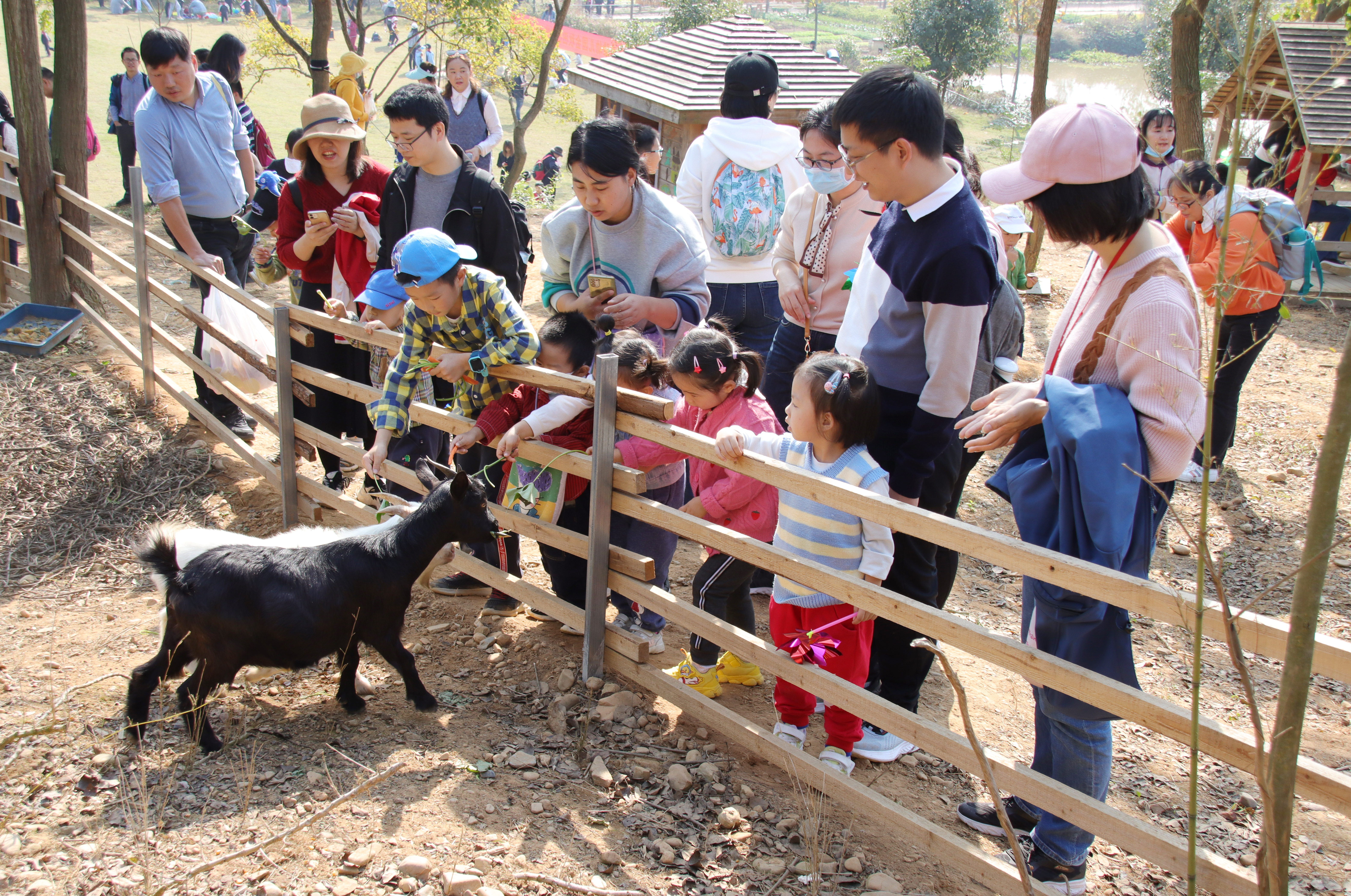 第二个项目是小小饲养员。在所有的孩子都拿到了胡萝卜和青菜后,大伙儿都迫不及待的当起了饲养员,去给山羊和小白兔投食。没见过山羊和小白兔的孩子们,有点紧张、有点好奇、又有点兴奋,大家围着栅栏争相投喂食物,投喂成功的小朋友会开心地欢呼跳跃起来。