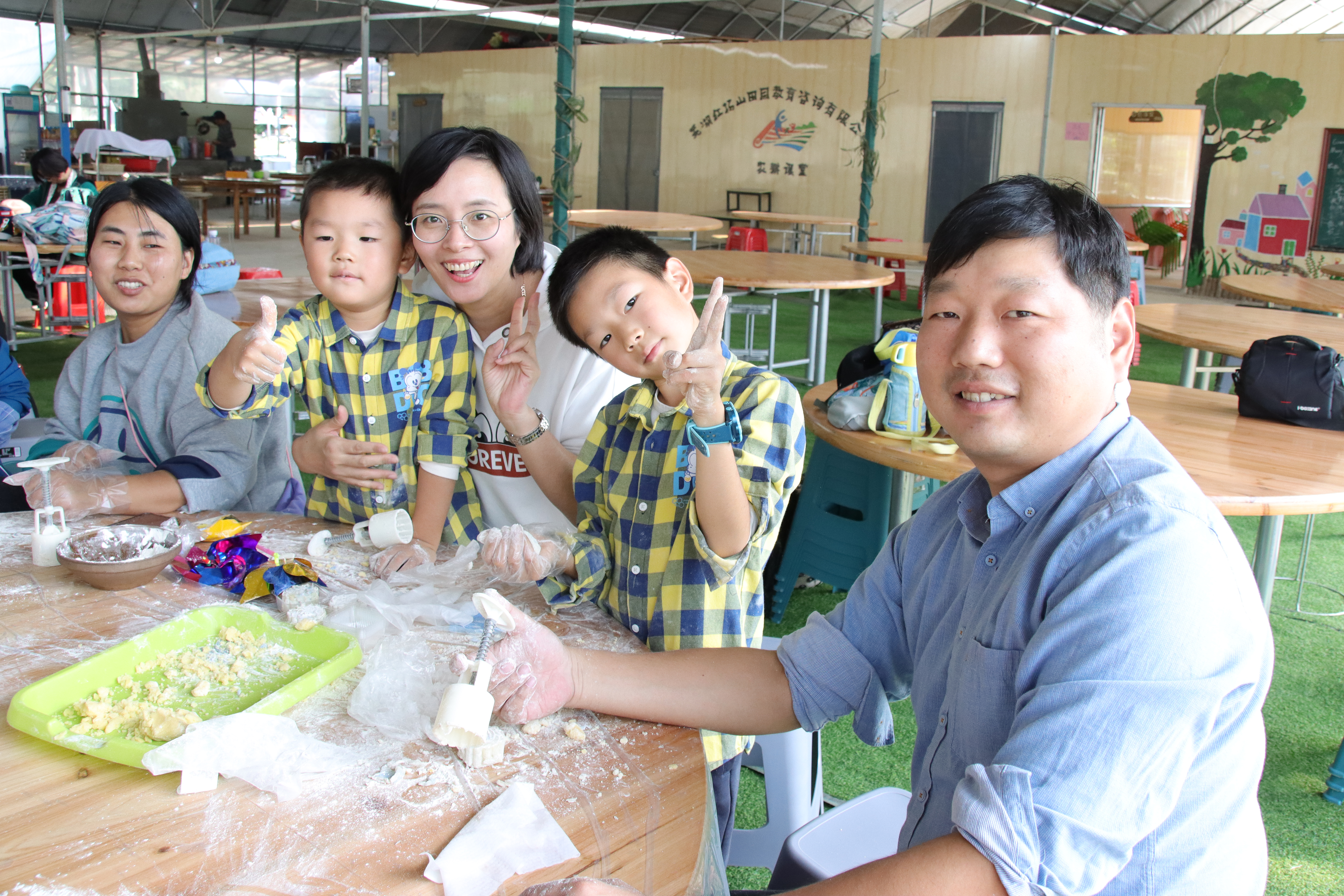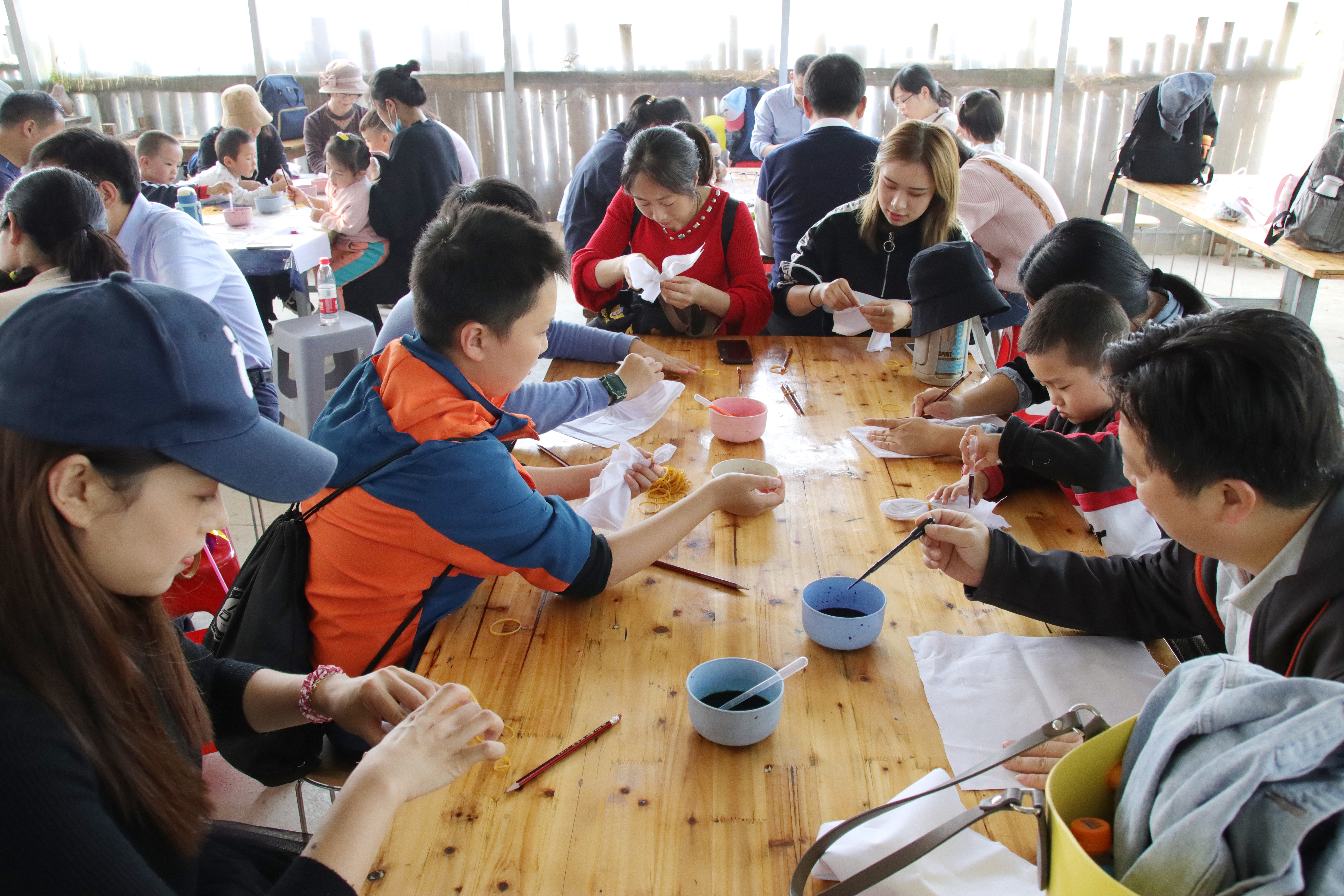 下午的活动同样精彩。在农场工作人员的指导下,家长和小朋友合作开展印染活动。不一会,孩子们就挥舞着被染得五颜六色的小手欢呼起来,“我的爱心染好了”、“我这个是同心圆”、“我染的是闪电”……一时间,几十副花花绿绿的作品摊放在草地上晾晒,非常壮观。