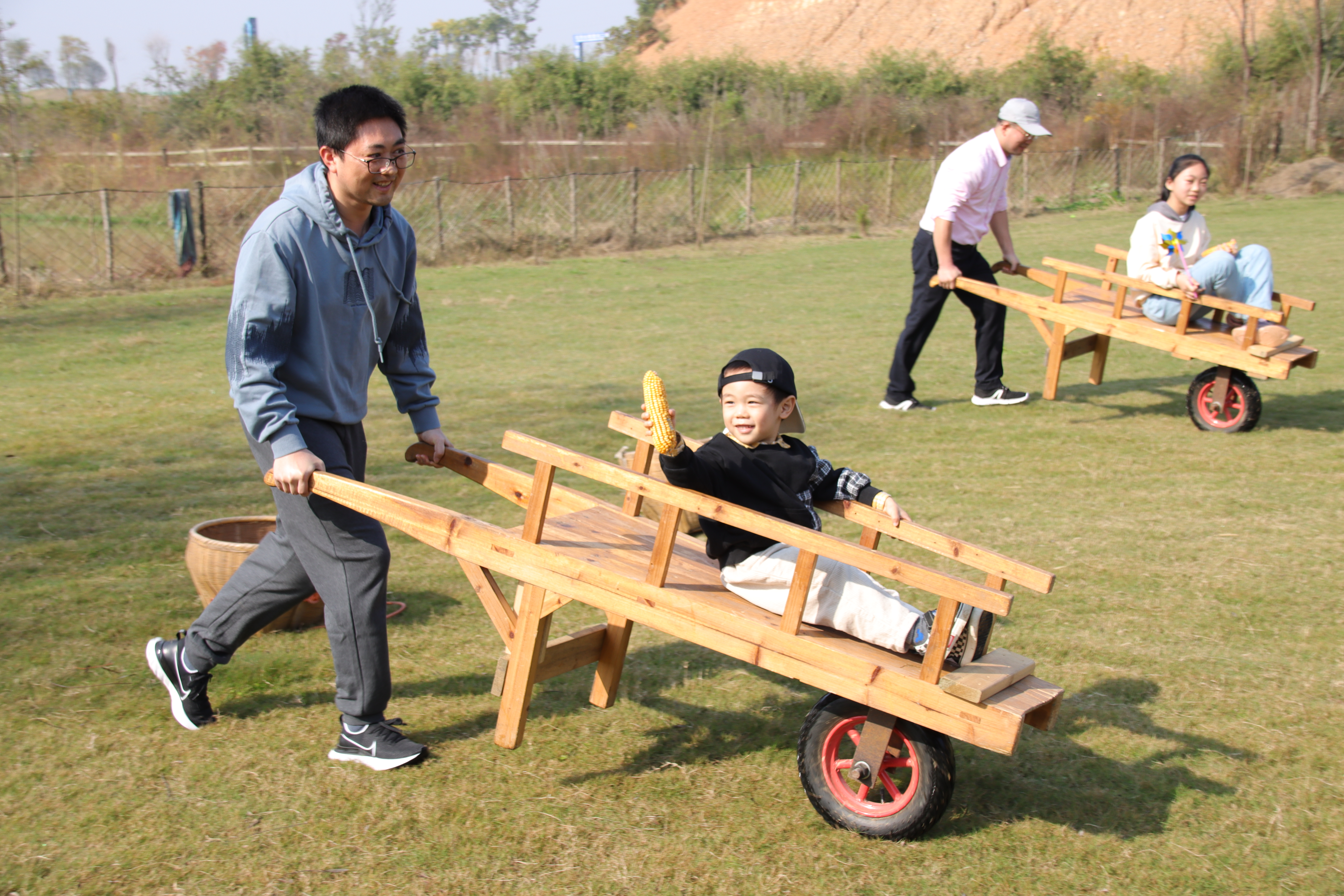 在一大片草地上,小朋友们奔跑热身后,活动就正式开始了。第一个项目是推独轮车。规则是家长负责推车,孩子们坐在独轮车上,安全抵达终点并拿到玉米后再返程找到工作人员兑换成胡萝卜和青菜。看,号令一响,只见参加比赛的爸爸们都卯足劲儿,推着车飞快地冲向终点前进,车上的宝宝们开心地大叫着,旁边的妈妈们也大声喊着加油,气氛一下子热闹了起来。