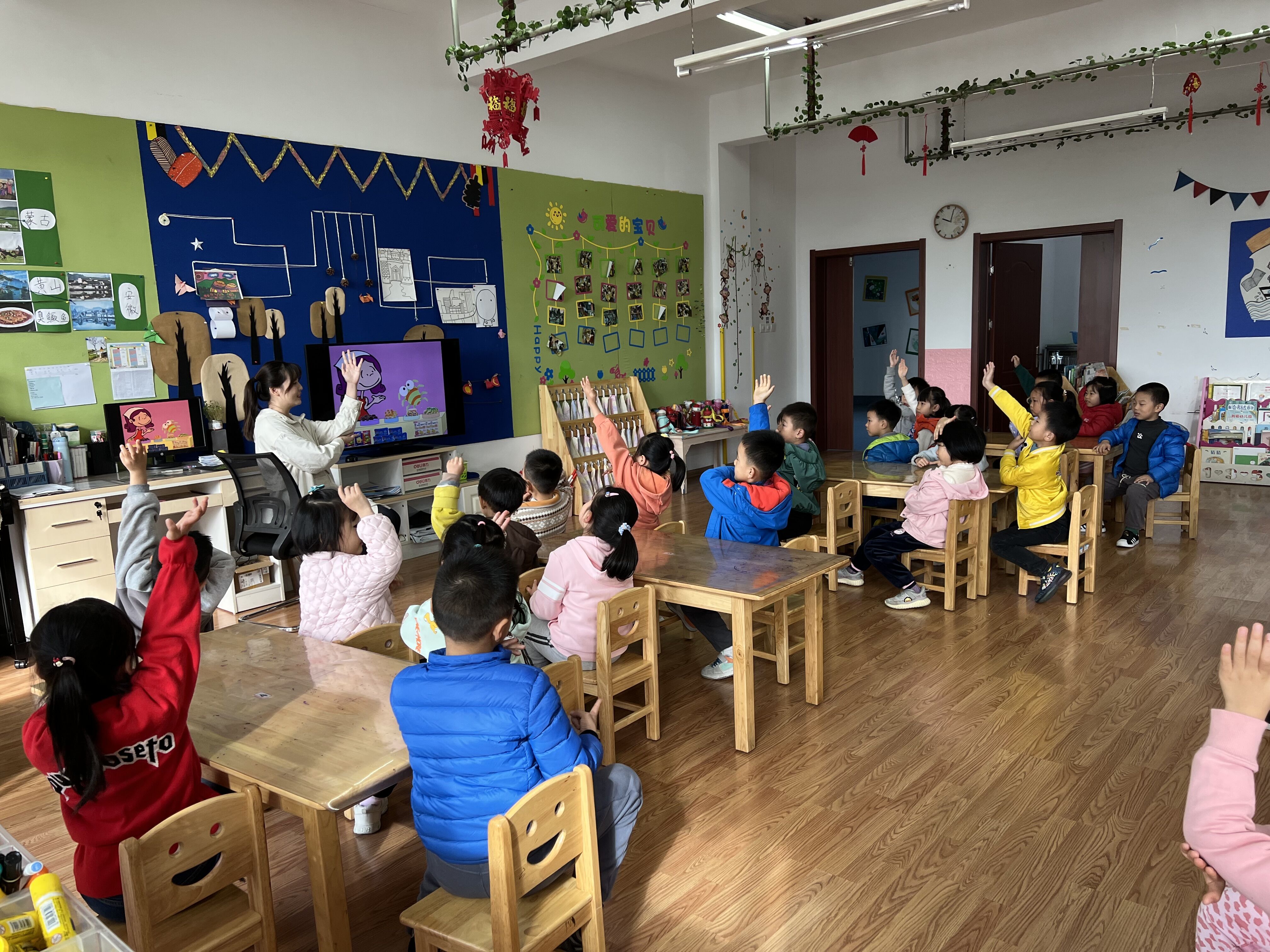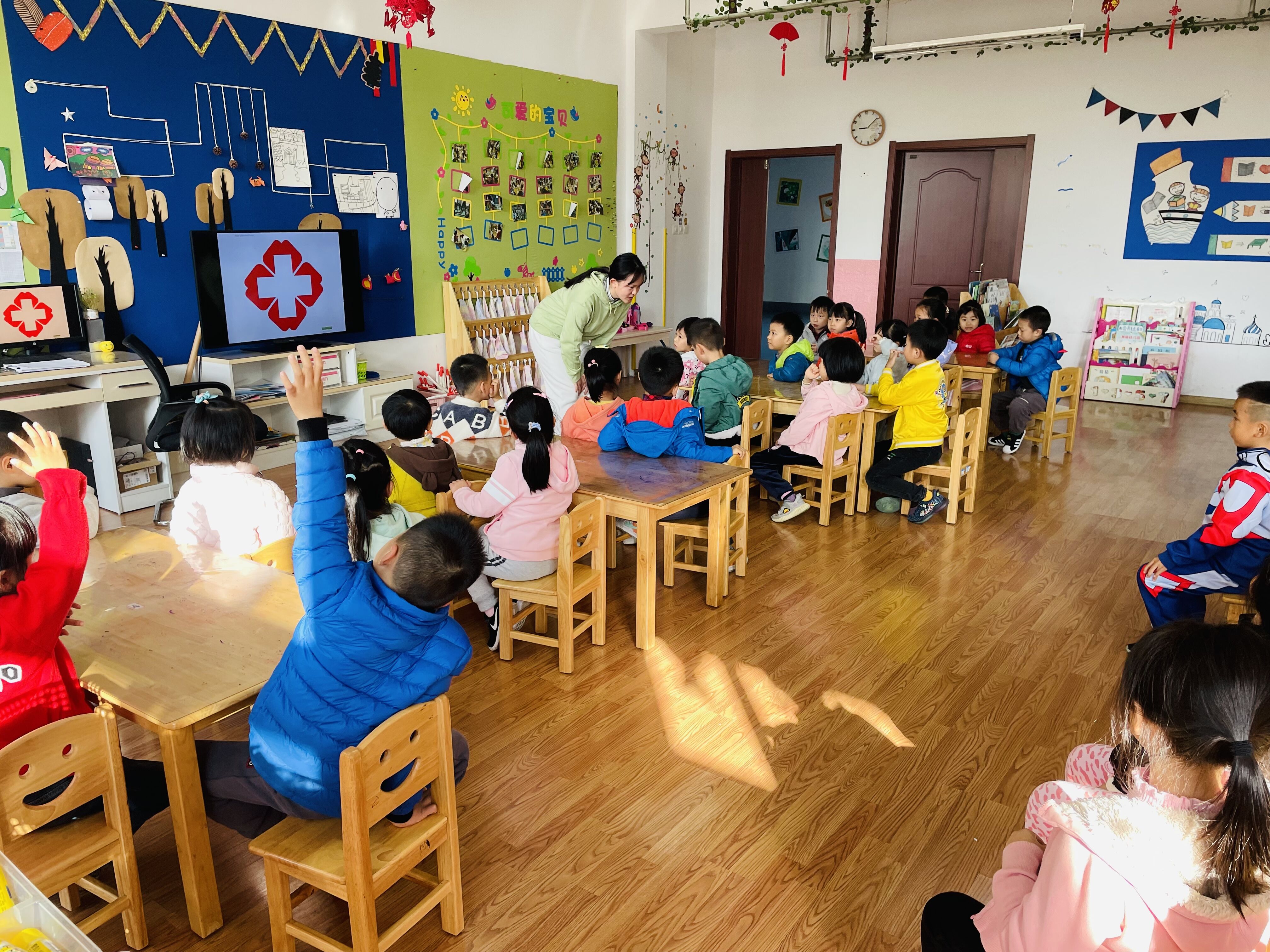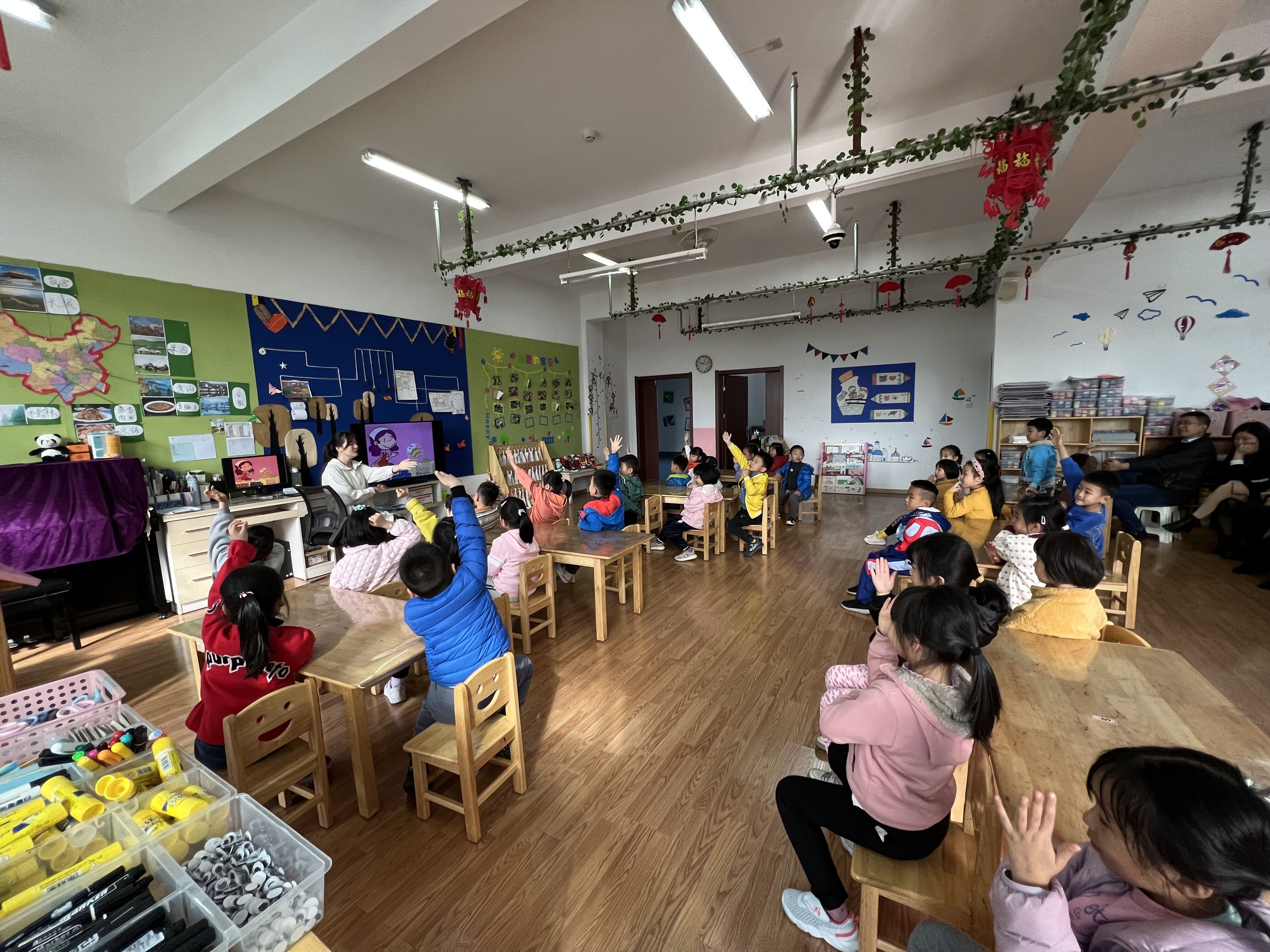 在教学活动展示环节,为了让孩子们学会探索、思考和团结互助,大一班两位老师根据孩子的年龄特点和发展需求,对活动进行了精心的设计。首先,宋老师通过询问父母的职业导入活动主题《各行各业的人》,再通过提问和看图讲述加深了孩子们对超市、医院和银行等各个不同职业的认知和了解。在认知“银行”时,孩子们争先恐后的举手充当银行“点钞员”,现场气氛活跃。第二节是李老师的科学活动《神奇的糖果店》,李老师通过讲述小朋友在糖果店买糖果的故事,让孩子们对数字有了更进一步的认识,并掌握了如何进行“统计”,得出一个正确的结果。通过李老师详细的分析和引导,小朋友们的逻辑思维能力得到了很好的锻炼。整个活动过程是在轻松愉快的氛围中进行的,老师们运用生动有趣的儿童化语言,采用现代化的多媒体技术,激发了小朋友们浓厚的学习兴趣,课堂上孩子们都高举起小手,说出的童言妙语感染了在座的每一位家长,大家纷纷用掌声给予赞赏。