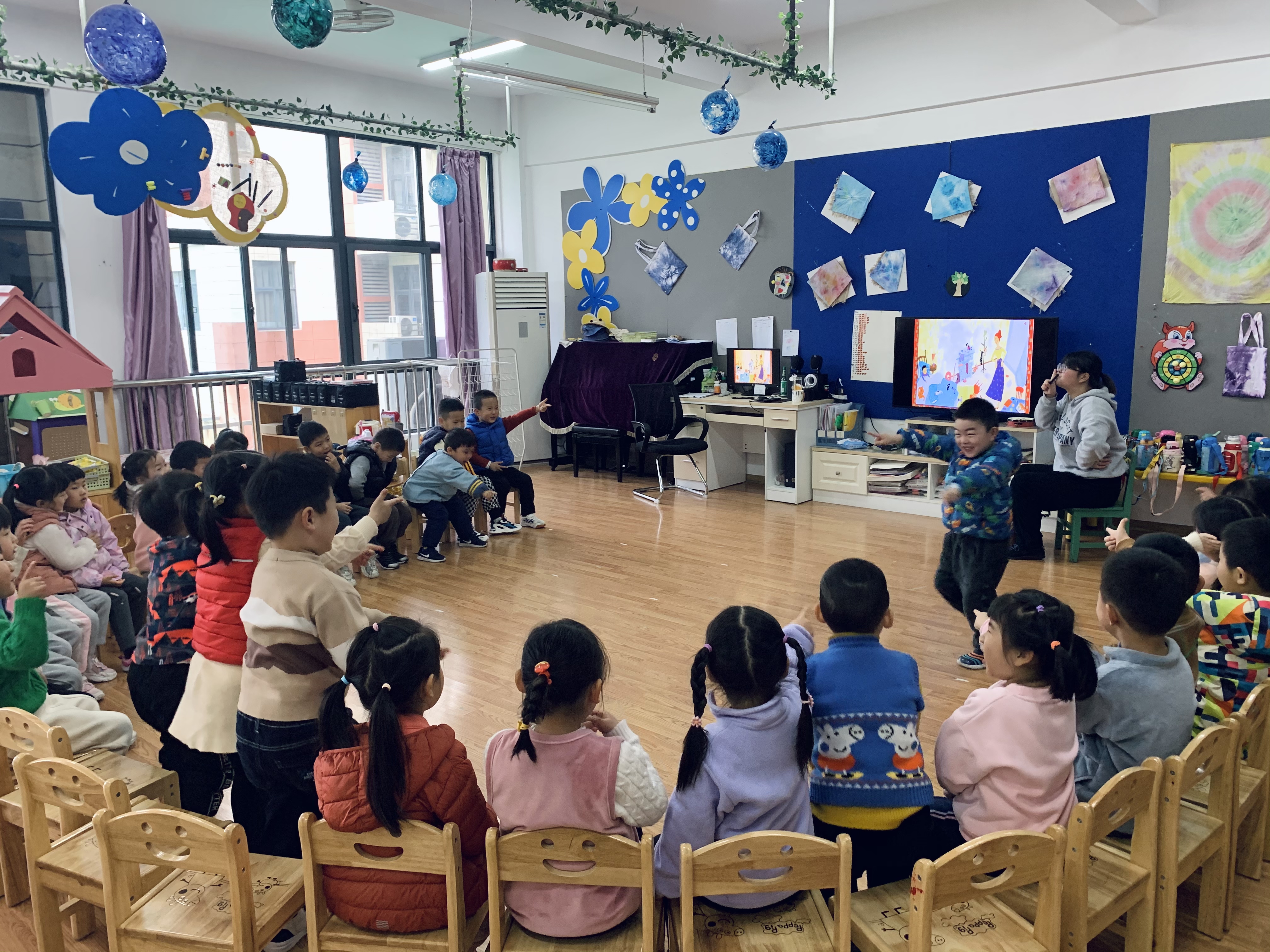 集体教学环节,曹老师带着“章鱼先生”,开着小火车,“嘀嘀嘀嘀嘀,谁要来买伞?你是谁?你长什么样?”诙谐逗趣的语言、丰富夸张的动作,让孩子们乐不可支!刘老师带着孩子们研究了马克的“一起一起分类病”,大家身临其中,时而欢笑时而忧愁,还一起动手操作,帮助马克解决了所有问题。