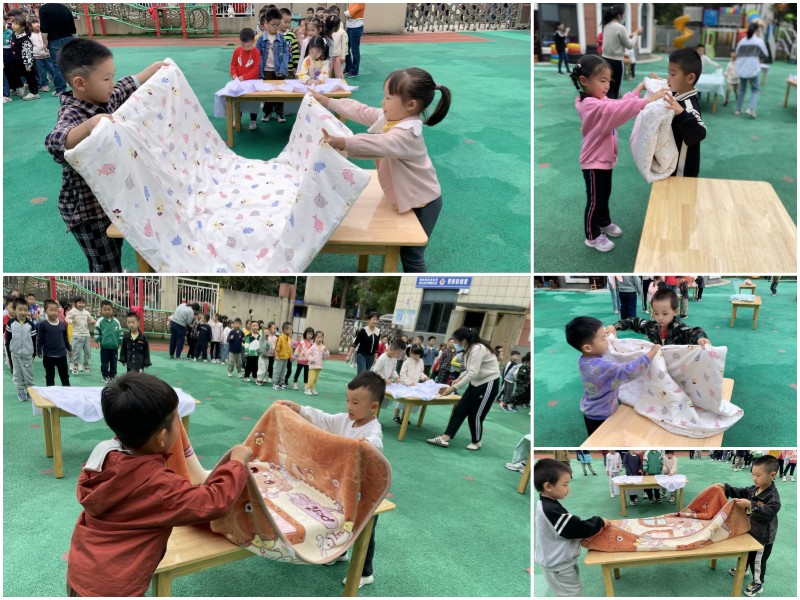 大班幼儿两两一组,每班派出15支参赛队伍,比赛内容分为三项,分别为“扣扣子”、“叠被子”、“整理收纳物品”。小朋友们用灵巧的小手快速又精准地扣上大衣的扣子;随后立即奔向下一关卡,两两合作,整齐地叠好被子;最后再将散落在桌面上的各类物品整理好并装进书包。率先完成比赛的小选手们,高高举起小手,稚嫩的小脸上洋溢着灿烂的笑容。