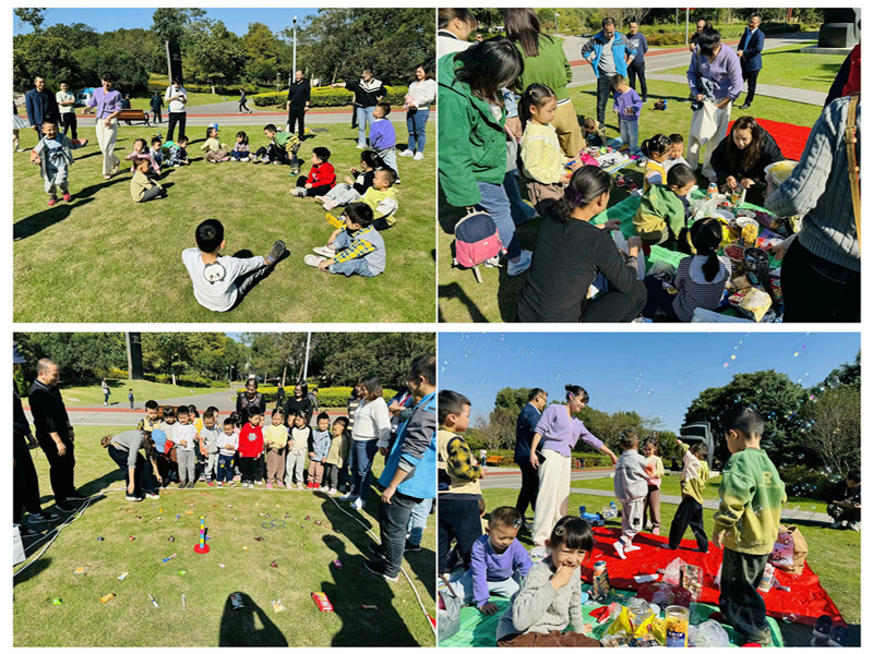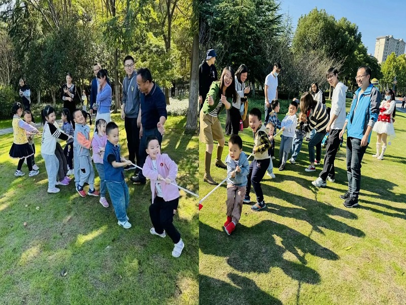 游戏环节,更是吸引了小朋友们的积极参与,他们在拔河比赛中相互鼓励加油、在套圈游戏中相互比拼、在丛林探险相互合作、在丢手绢过程中奔跑、在吹泡泡游戏中追逐、在收集树叶中认知等。